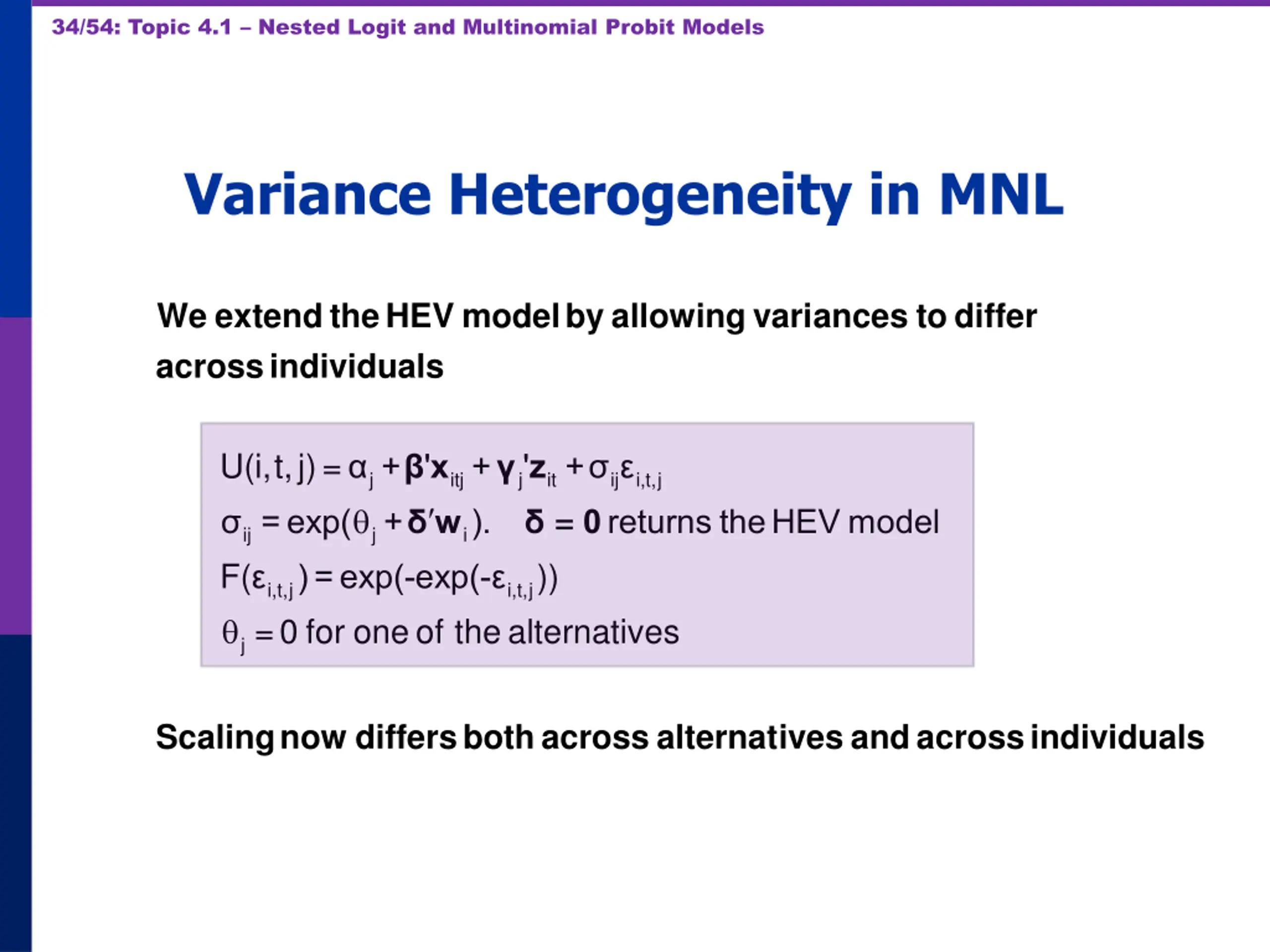 34/54: Topic 4.1 Nested Logit and Multinomial Probit Models Variance Heterogeneity in MNL We extend the HEV model by allowing variances to differ across individuals U(i,t,j)= + ' =exp( F( j =0 for one of the alternatives x + z ' + j itj j it ij i,t,j returns the HEV model 0 = ). + w ij j i )) )=exp(-exp(- i,t,j i ,t,j Scaling now differs both across alternatives and across individuals
