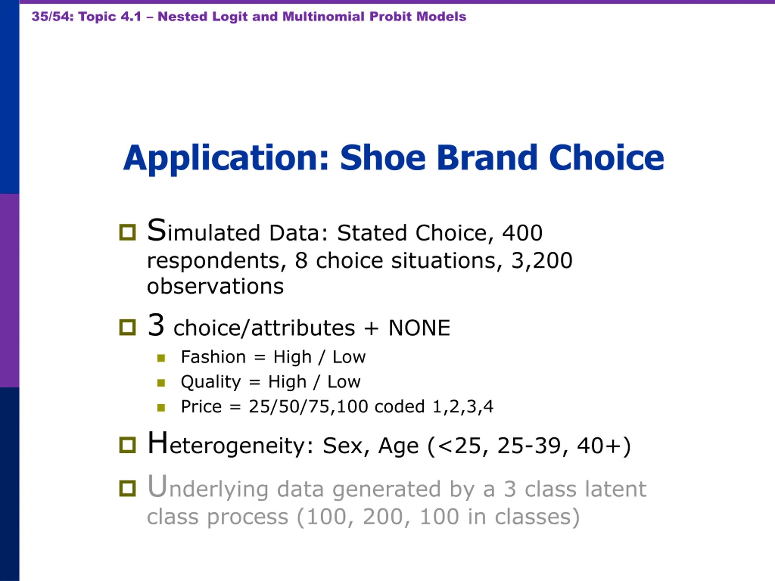 35/54: Topic 4.1 Nested Logit and Multinomial Probit Models Application: Shoe Brand Choice Simulated Data: Stated Choice, 400 respondents, 8 choice situations, 3,200 observations 3 choice/attributes + NONE Fashion = High / Low Quality = High / Low Price = 25/50/75,100 coded 1,2,3,4 Heterogeneity: Sex, Age (<25, 25-39, 40+) Underlying data generated by a 3 class latent class process (100, 200, 100 in classes)