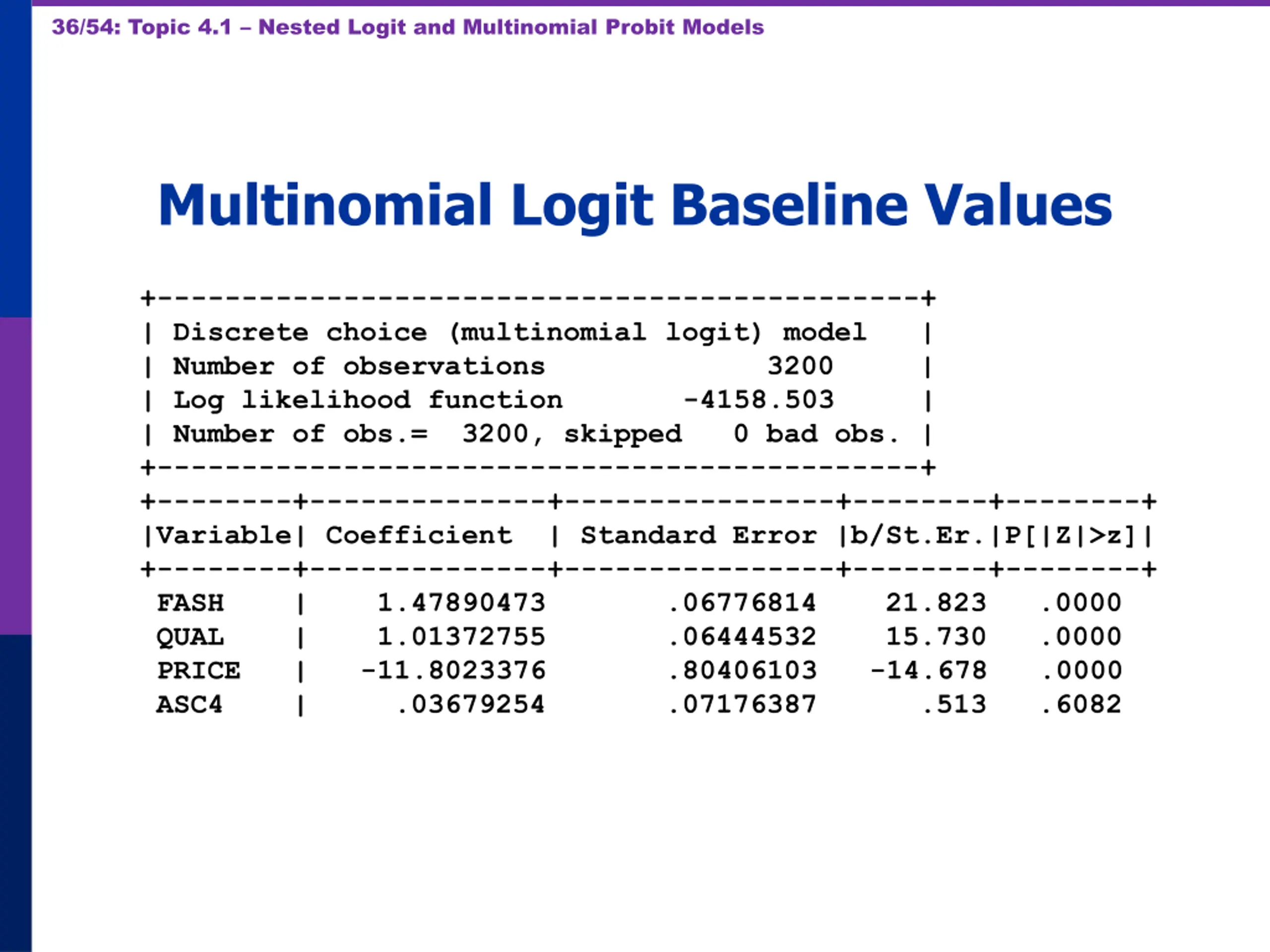 36/54: Topic 4.1 Nested Logit and Multinomial Probit Models Multinomial Logit Baseline Values +---------------------------------------------+ | Discrete choice (multinomial logit) model | | Number of observations 3200 | | Log likelihood function -4158.503 | | Number of obs.= 3200, skipped 0 bad obs. | +---------------------------------------------+ +--------+--------------+----------------+--------+--------+ |Variable| Coefficient | Standard Error |b/St.Er.|P[|Z|>z]| +--------+--------------+----------------+--------+--------+ FASH | 1.47890473 .06776814 21.823 .0000 QUAL | 1.01372755 .06444532 15.730 .0000 PRICE | -11.8023376 .80406103 -14.678 .0000 ASC4 | .03679254 .07176387 .513 .6082