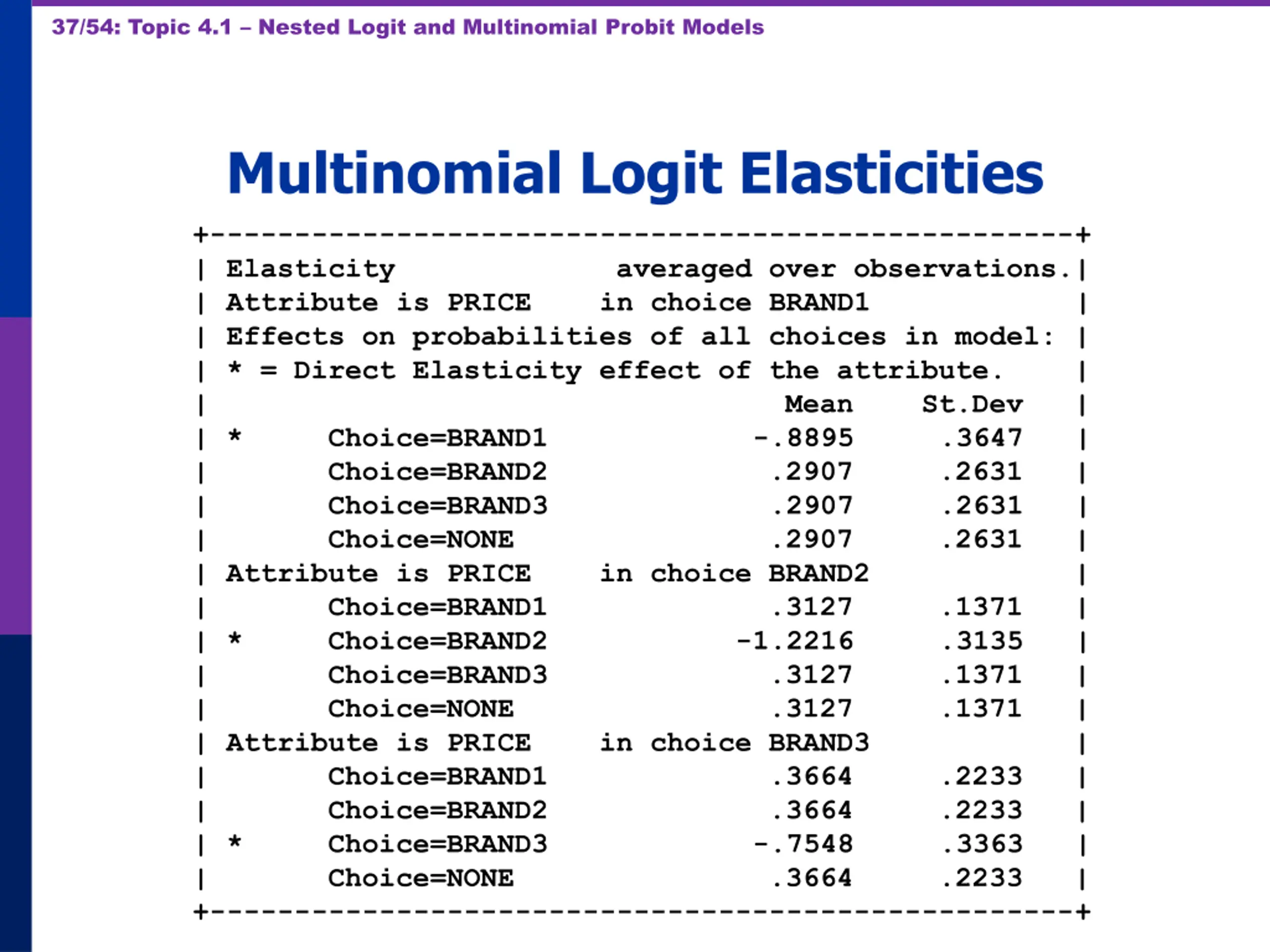 37/54: Topic 4.1 Nested Logit and Multinomial Probit Models Multinomial Logit Elasticities +---------------------------------------------------+ | Elasticity averaged over observations.| | Attribute is PRICE in choice BRAND1 | | Effects on probabilities of all choices in model: | | * = Direct Elasticity effect of the attribute. | | Mean St.Dev | | * Choice=BRAND1 -.8895 .3647 | | Choice=BRAND2 .2907 .2631 | | Choice=BRAND3 .2907 .2631 | | Choice=NONE .2907 .2631 | | Attribute is PRICE in choice BRAND2 | | Choice=BRAND1 .3127 .1371 | | * Choice=BRAND2 -1.2216 .3135 | | Choice=BRAND3 .3127 .1371 | | Choice=NONE .3127 .1371 | | Attribute is PRICE in choice BRAND3 | | Choice=BRAND1 .3664 .2233 | | Choice=BRAND2 .3664 .2233 | | * Choice=BRAND3 -.7548 .3363 | | Choice=NONE .3664 .2233 | +---------------------------------------------------+