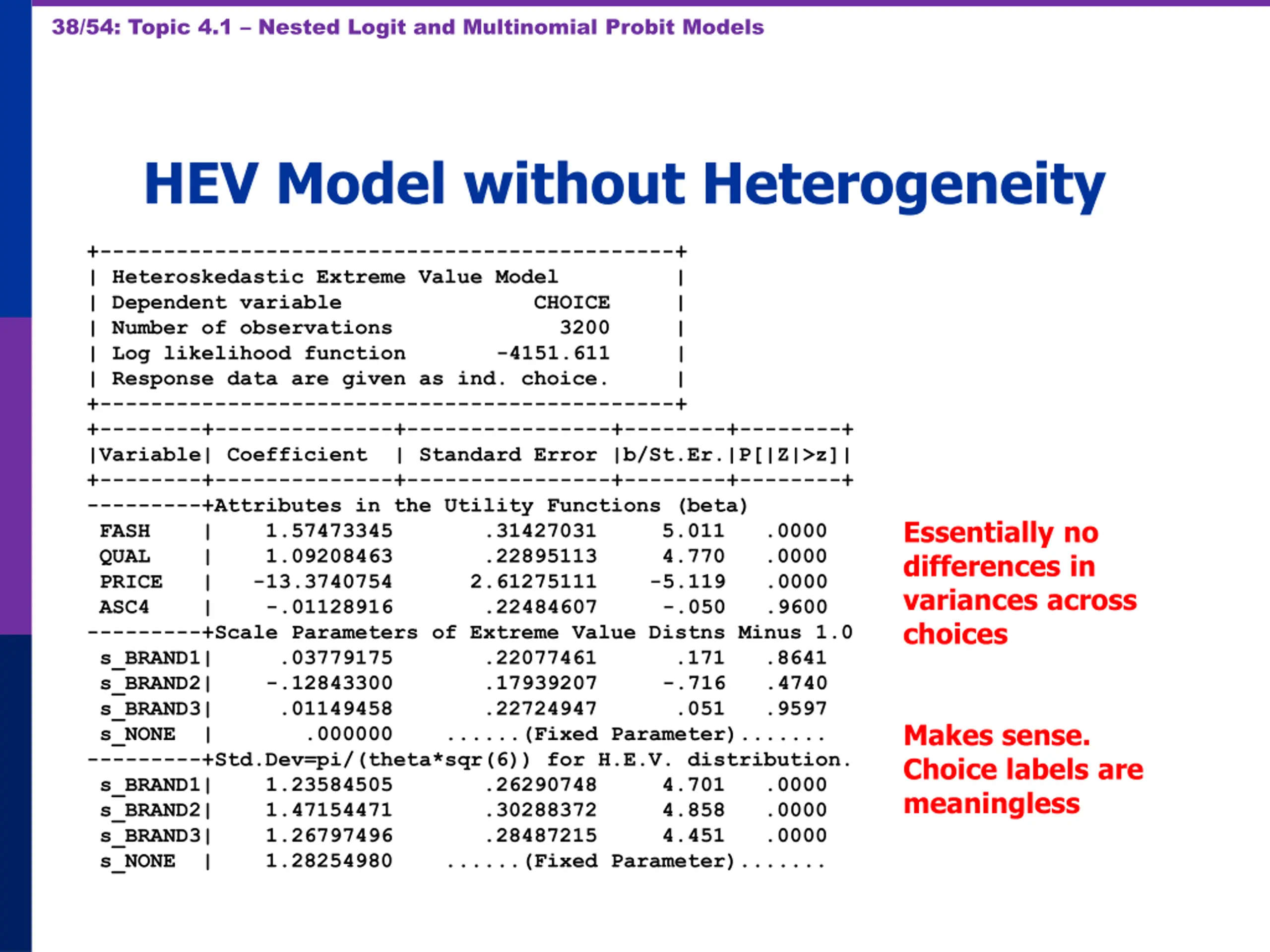 38/54: Topic 4.1 Nested Logit and Multinomial Probit Models HEV Model without Heterogeneity +---------------------------------------------+ | Heteroskedastic Extreme Value Model | | Dependent variable CHOICE | | Number of observations 3200 | | Log likelihood function -4151.611 | | Response data are given as ind. choice. | +---------------------------------------------+ +--------+--------------+----------------+--------+--------+ |Variable| Coefficient | Standard Error |b/St.Er.|P[|Z|>z]| +--------+--------------+----------------+--------+--------+ ---------+Attributes in the Utility Functions (beta) FASH | 1.57473345 .31427031 5.011 .0000 QUAL | 1.09208463 .22895113 4.770 .0000 PRICE | -13.3740754 2.61275111 -5.119 .0000 ASC4 | -.01128916 .22484607 -.050 .9600 ---------+Scale Parameters of Extreme Value Distns Minus 1.0 s_BRAND1| .03779175 .22077461 .171 .8641 s_BRAND2| -.12843300 .17939207 -.716 .4740 s_BRAND3| .01149458 .22724947 .051 .9597 s_NONE | .000000 ......(Fixed Parameter)....... ---------+Std.Dev=pi/(theta*sqr(6)) for H.E.V. distribution. s_BRAND1| 1.23584505 .26290748 4.701 .0000 s_BRAND2| 1.47154471 .30288372 4.858 .0000 s_BRAND3| 1.26797496 .28487215 4.451 .0000 s_NONE | 1.28254980 ......(Fixed Parameter)....... Essentially no differences in variances across choices Makes sense. Choice labels are meaningless
