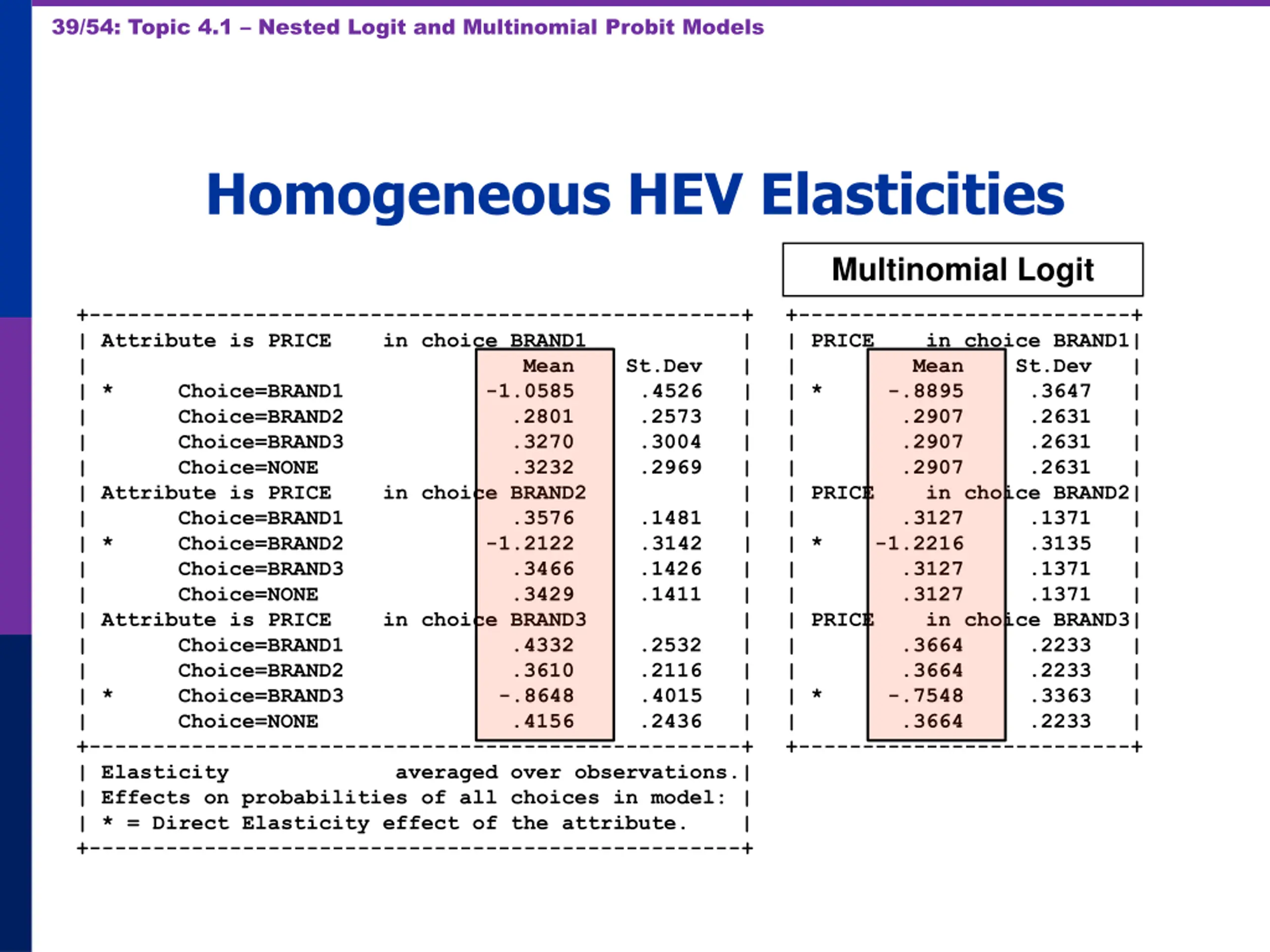 39/54: Topic 4.1 Nested Logit and Multinomial Probit Models Homogeneous HEV Elasticities Multinomial Logit +---------------------------------------------------+ | Attribute is PRICE in choice BRAND1 | | Mean St.Dev | | * Choice=BRAND1 -1.0585 .4526 | | Choice=BRAND2 .2801 .2573 | | Choice=BRAND3 .3270 .3004 | | Choice=NONE .3232 .2969 | | Attribute is PRICE in choice BRAND2 | | Choice=BRAND1 .3576 .1481 | | * Choice=BRAND2 -1.2122 .3142 | | Choice=BRAND3 .3466 .1426 | | Choice=NONE .3429 .1411 | | Attribute is PRICE in choice BRAND3 | | Choice=BRAND1 .4332 .2532 | | Choice=BRAND2 .3610 .2116 | | * Choice=BRAND3 -.8648 .4015 | | Choice=NONE .4156 .2436 | +---------------------------------------------------+ | Elasticity averaged over observations.| | Effects on probabilities of all choices in model: | | * = Direct Elasticity effect of the attribute. | +---------------------------------------------------+ +--------------------------+ | PRICE in choice BRAND1| | Mean St.Dev | | * -.8895 .3647 | | .2907 .2631 | | .2907 .2631 | | .2907 .2631 | | PRICE in choice BRAND2| | .3127 .1371 | | * -1.2216 .3135 | | .3127 .1371 | | .3127 .1371 | | PRICE in choice BRAND3| | .3664 .2233 | | .3664 .2233 | | * -.7548 .3363 | | .3664 .2233 | +--------------------------+