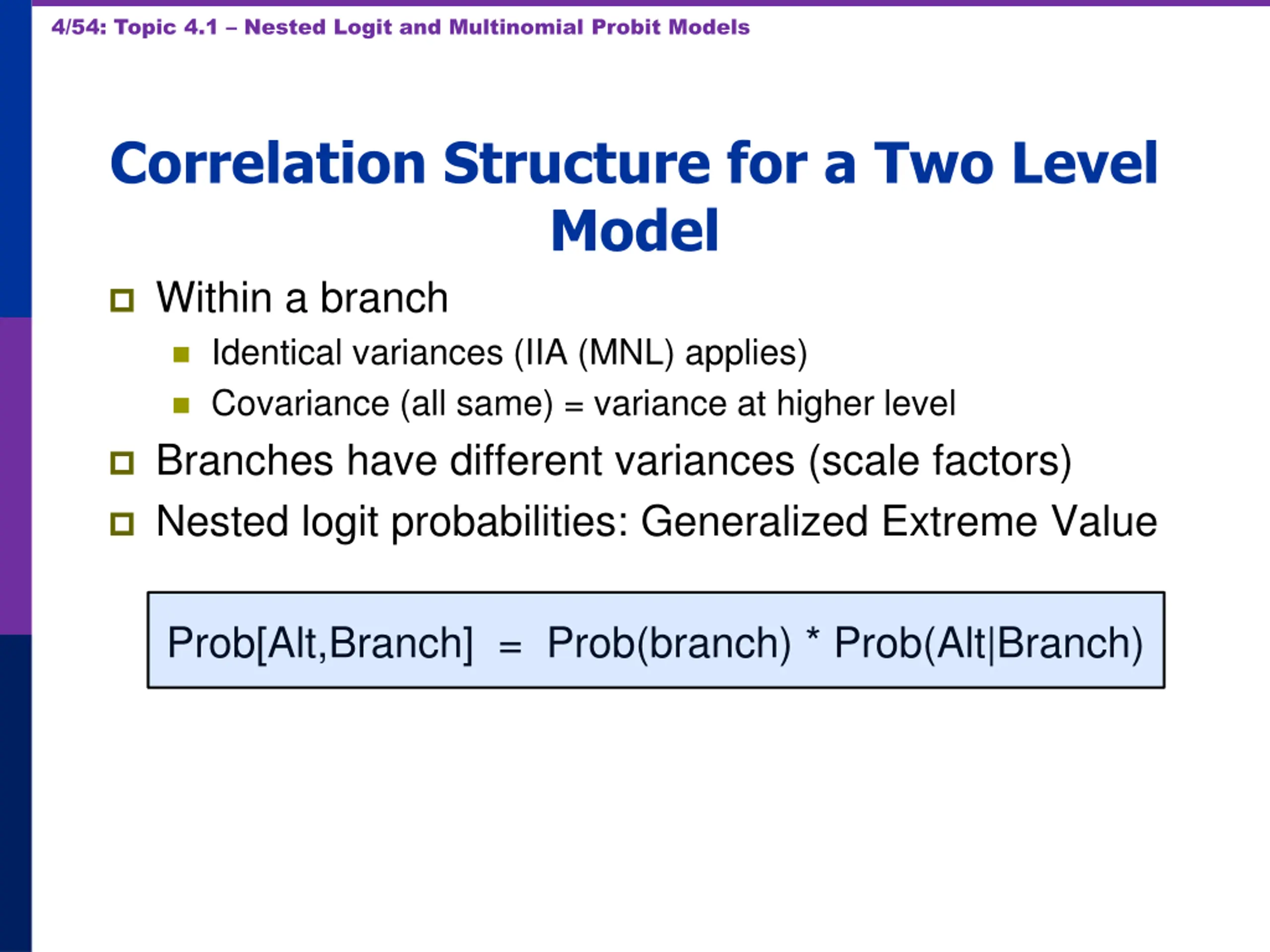 4/54: Topic 4.1 Nested Logit and Multinomial Probit Models Correlation Structure for a Two Level Model Within a branch Identical variances (IIA (MNL) applies) Covariance (all same) = variance at higher level Branches have different variances (scale factors) Nested logit probabilities: Generalized Extreme Value Prob[Alt,Branch] = Prob(branch) * Prob(Alt|Branch)