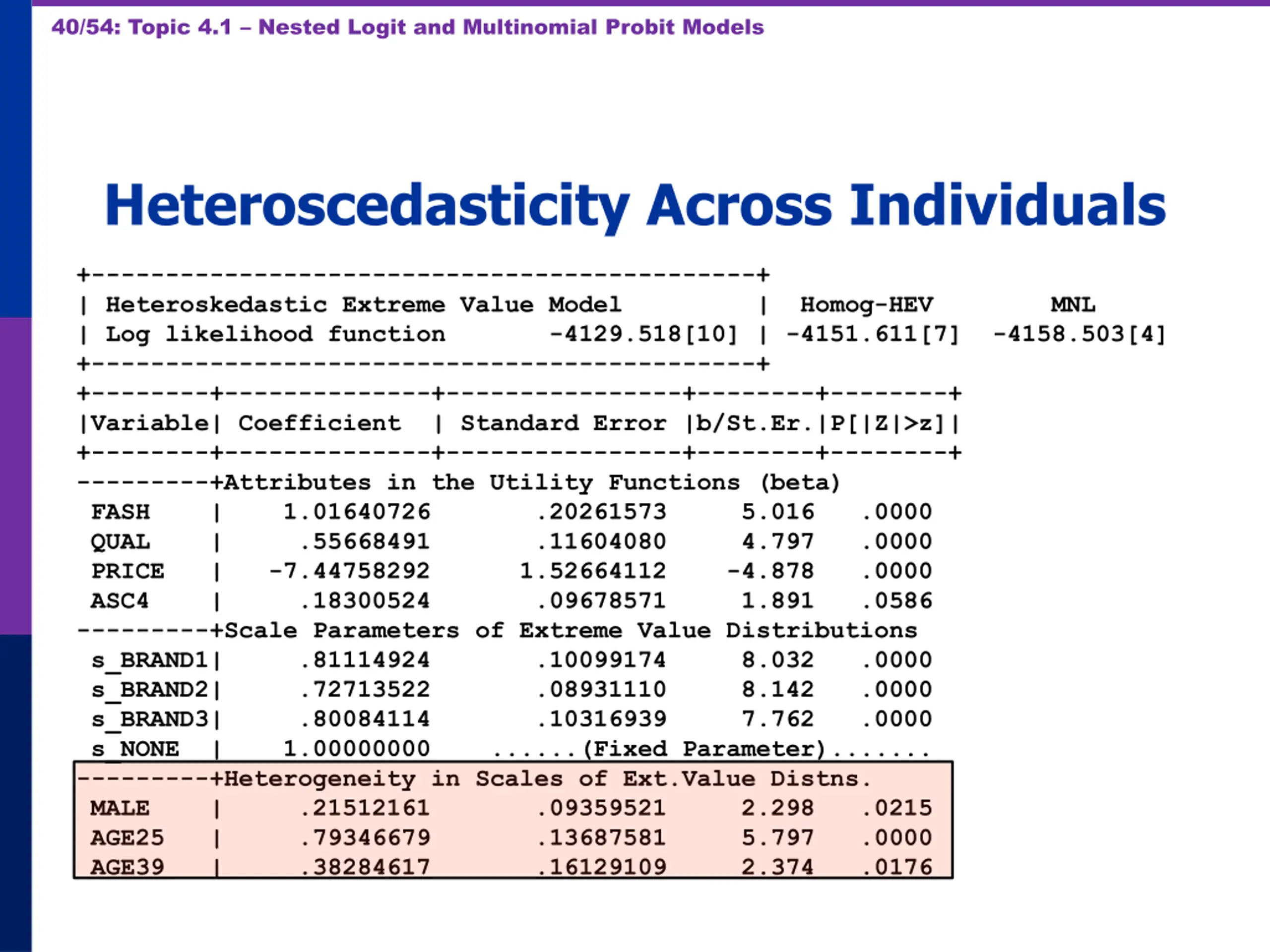40/54: Topic 4.1 Nested Logit and Multinomial Probit Models Heteroscedasticity Across Individuals +---------------------------------------------+ | Heteroskedastic Extreme Value Model | Homog-HEV MNL | Log likelihood function -4129.518[10] | -4151.611[7] -4158.503[4] +---------------------------------------------+ +--------+--------------+----------------+--------+--------+ |Variable| Coefficient | Standard Error |b/St.Er.|P[|Z|>z]| +--------+--------------+----------------+--------+--------+ ---------+Attributes in the Utility Functions (beta) FASH | 1.01640726 .20261573 5.016 .0000 QUAL | .55668491 .11604080 4.797 .0000 PRICE | -7.44758292 1.52664112 -4.878 .0000 ASC4 | .18300524 .09678571 1.891 .0586 ---------+Scale Parameters of Extreme Value Distributions s_BRAND1| .81114924 .10099174 8.032 .0000 s_BRAND2| .72713522 .08931110 8.142 .0000 s_BRAND3| .80084114 .10316939 7.762 .0000 s_NONE | 1.00000000 ......(Fixed Parameter)....... ---------+Heterogeneity in Scales of Ext.Value Distns. MALE | .21512161 .09359521 2.298 .0215 AGE25 | .79346679 .13687581 5.797 .0000 AGE39 | .38284617 .16129109 2.374 .0176
