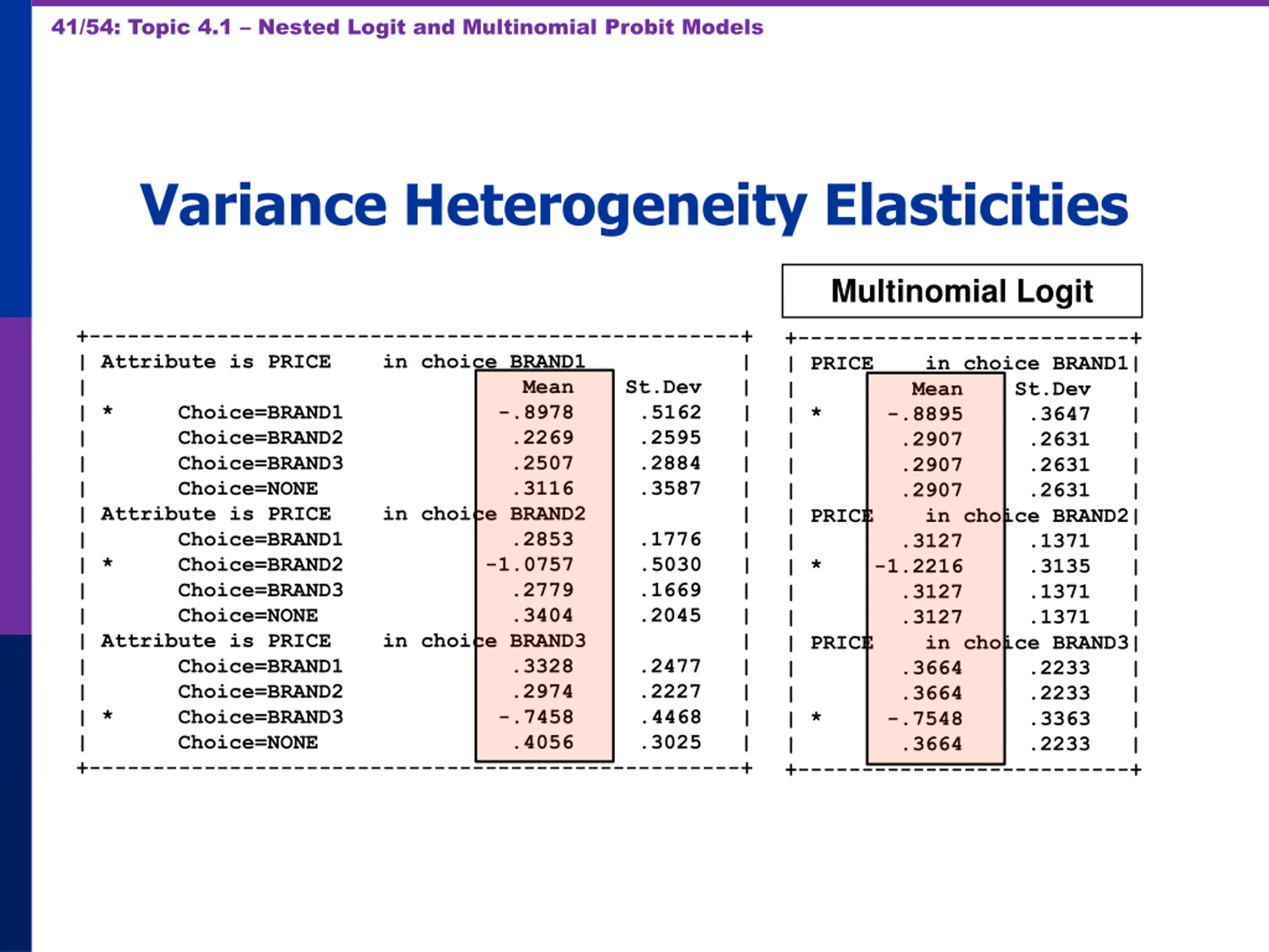 41/54: Topic 4.1 Nested Logit and Multinomial Probit Models Variance Heterogeneity Elasticities Multinomial Logit +---------------------------------------------------+ | Attribute is PRICE in choice BRAND1 | | Mean St.Dev | | * Choice=BRAND1 -.8978 .5162 | | Choice=BRAND2 .2269 .2595 | | Choice=BRAND3 .2507 .2884 | | Choice=NONE .3116 .3587 | | Attribute is PRICE in choice BRAND2 | | Choice=BRAND1 .2853 .1776 | | * Choice=BRAND2 -1.0757 .5030 | | Choice=BRAND3 .2779 .1669 | | Choice=NONE .3404 .2045 | | Attribute is PRICE in choice BRAND3 | | Choice=BRAND1 .3328 .2477 | | Choice=BRAND2 .2974 .2227 | | * Choice=BRAND3 -.7458 .4468 | | Choice=NONE .4056 .3025 | +---------------------------------------------------+ +--------------------------+ | PRICE in choice BRAND1| | Mean St.Dev | | * -.8895 .3647 | | .2907 .2631 | | .2907 .2631 | | .2907 .2631 | | PRICE in choice BRAND2| | .3127 .1371 | | * -1.2216 .3135 | | .3127 .1371 | | .3127 .1371 | | PRICE in choice BRAND3| | .3664 .2233 | | .3664 .2233 | | * -.7548 .3363 | | .3664 .2233 | +--------------------------+