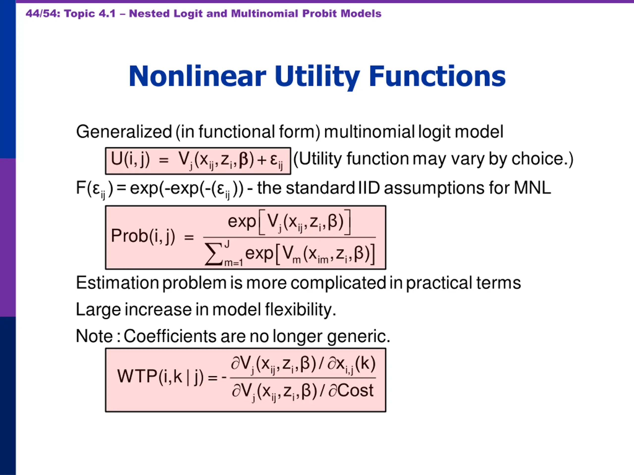 44/54: Topic 4.1 Nested Logit and Multinomial Probit Models Nonlinear Utility Functions Generalized (in functional form) multinomial logit model U(i,j) = V (x ,z, )+ (Utility function may vary by choice.) F( )=exp(-exp(-( )) - the standard IID assumptions for MNL ij i ij j ij ij exp V (x ,z, ) ij i j P rob(i,j) = J exp V (x ,z, ) m im i m=1 Estimation problem is more complicated in practical terms Large increase in model flexibility. Note: Coefficients are no longer generic. ij i V (x ,z, ) V (x ,z, ) / / x (k) Cost ij i i,j j WTP(i, k| j)=- j