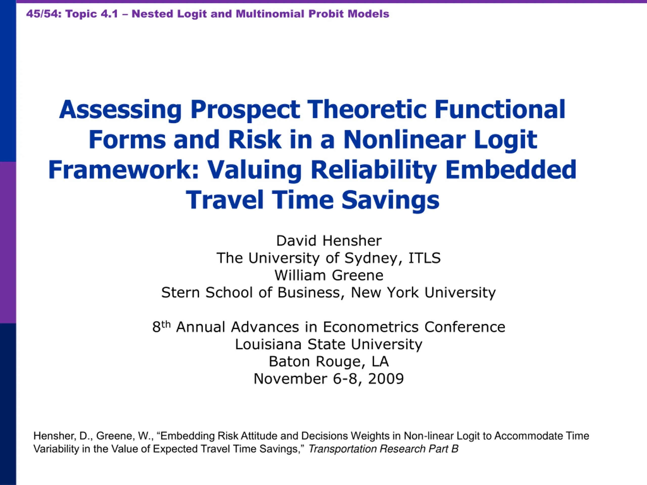 45/54: Topic 4.1 Nested Logit and Multinomial Probit Models Assessing Prospect Theoretic Functional Forms and Risk in a Nonlinear Logit Framework: Valuing Reliability Embedded Travel Time Savings David Hensher The University of Sydney, ITLS William Greene Stern School of Business, New York University 8th Annual Advances in Econometrics Conference Louisiana State University Baton Rouge, LA November 6-8, 2009 Hensher, D., Greene, W., Embedding Risk Attitude and Decisions Weights in Non-linear Logit to Accommodate Time Variability in the Value of Expected Travel Time Savings, Transportation Research Part B