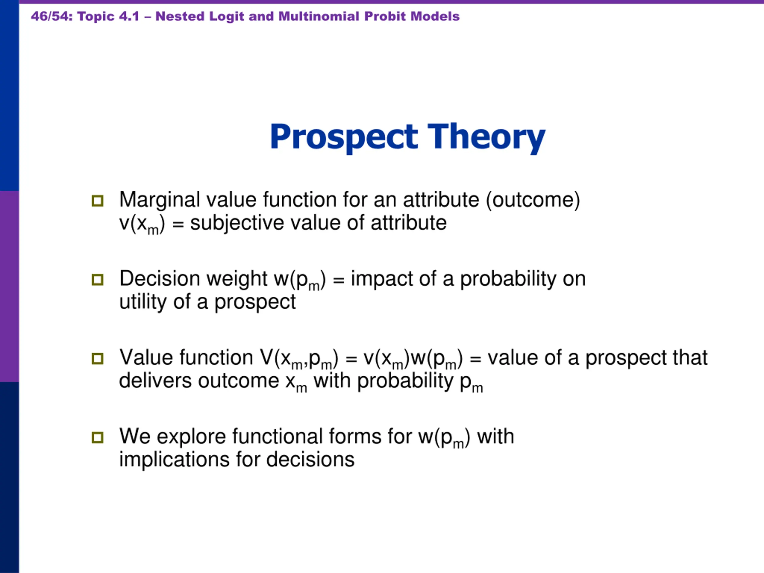 46/54: Topic 4.1 Nested Logit and Multinomial Probit Models Prospect Theory Marginal value function for an attribute (outcome) v(xm) = subjective value of attribute Decision weight w(pm) = impact of a probability on utility of a prospect Value function V(xm,pm) = v(xm)w(pm) = value of a prospect that delivers outcome xm with probability pm We explore functional forms for w(pm) with implications for decisions