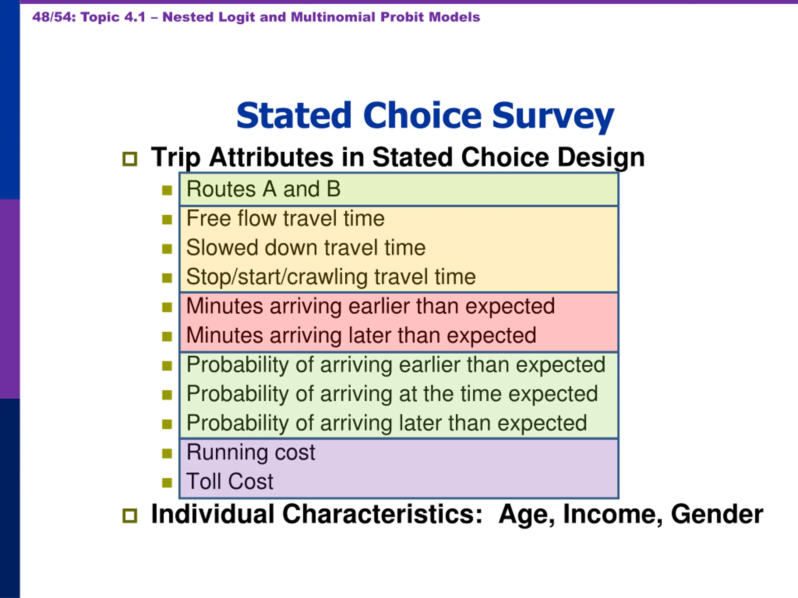 48/54: Topic 4.1 Nested Logit and Multinomial Probit Models Stated Choice Survey Trip Attributes in Stated Choice Design Routes A and B Free flow travel time Slowed down travel time Stop/start/crawling travel time Minutes arriving earlier than expected Minutes arriving later than expected Probability of arriving earlier than expected Probability of arriving at the time expected Probability of arriving later than expected Running cost Toll Cost Individual Characteristics: Age, Income, Gender