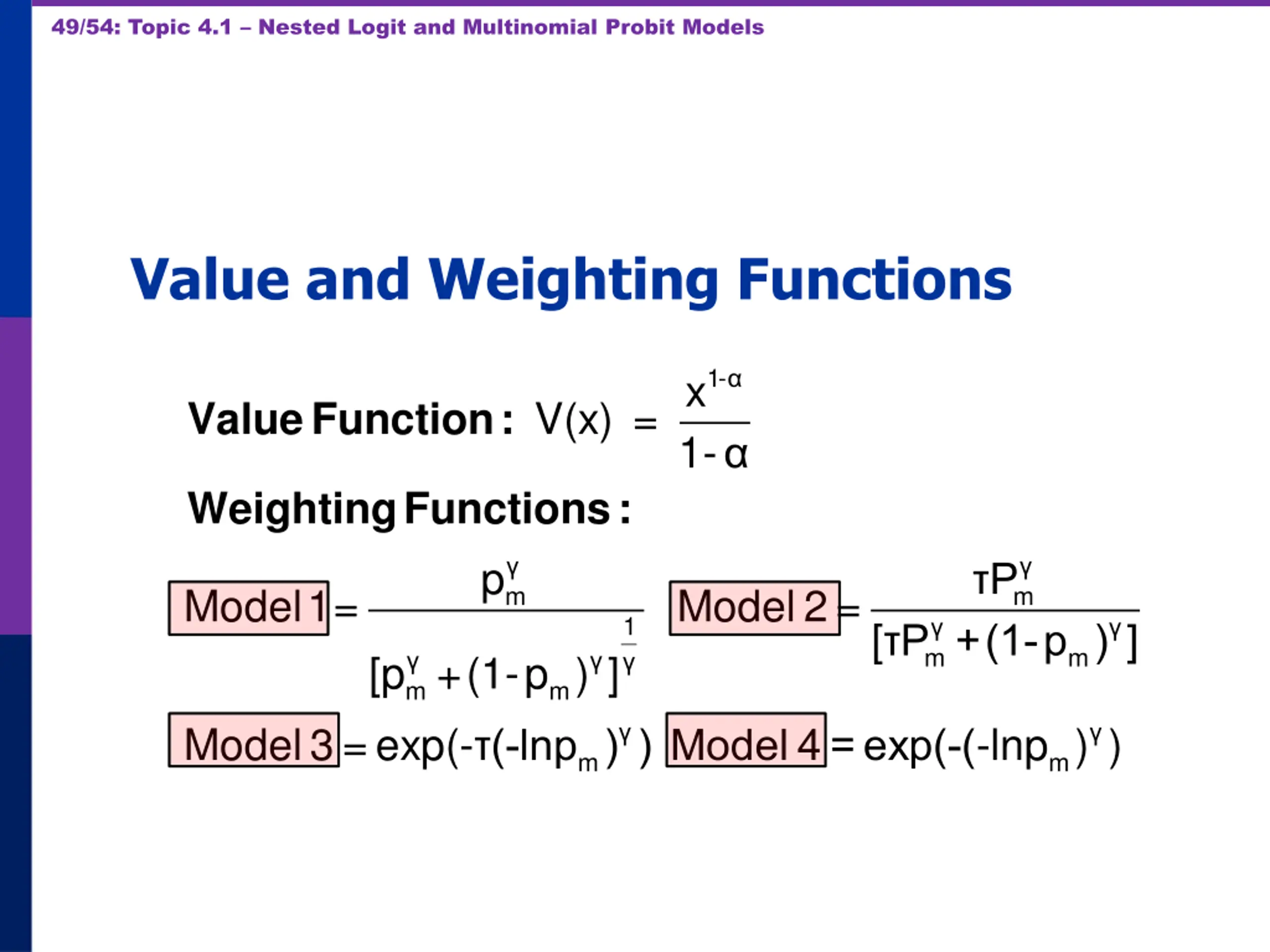49/54: Topic 4.1 Nested Logit and Multinomial Probit Models Value and Weighting Functions 1- x V(x) = 1- Value Function: Weighting Functions: m p P Model 1 = Model 2 = [ P +(1-p ) ] m 1 m m m [p +(1-p ) ] m Model 3 =exp(- (-lnp ) ) Model 4 = exp(-(-lnp ) ) m m