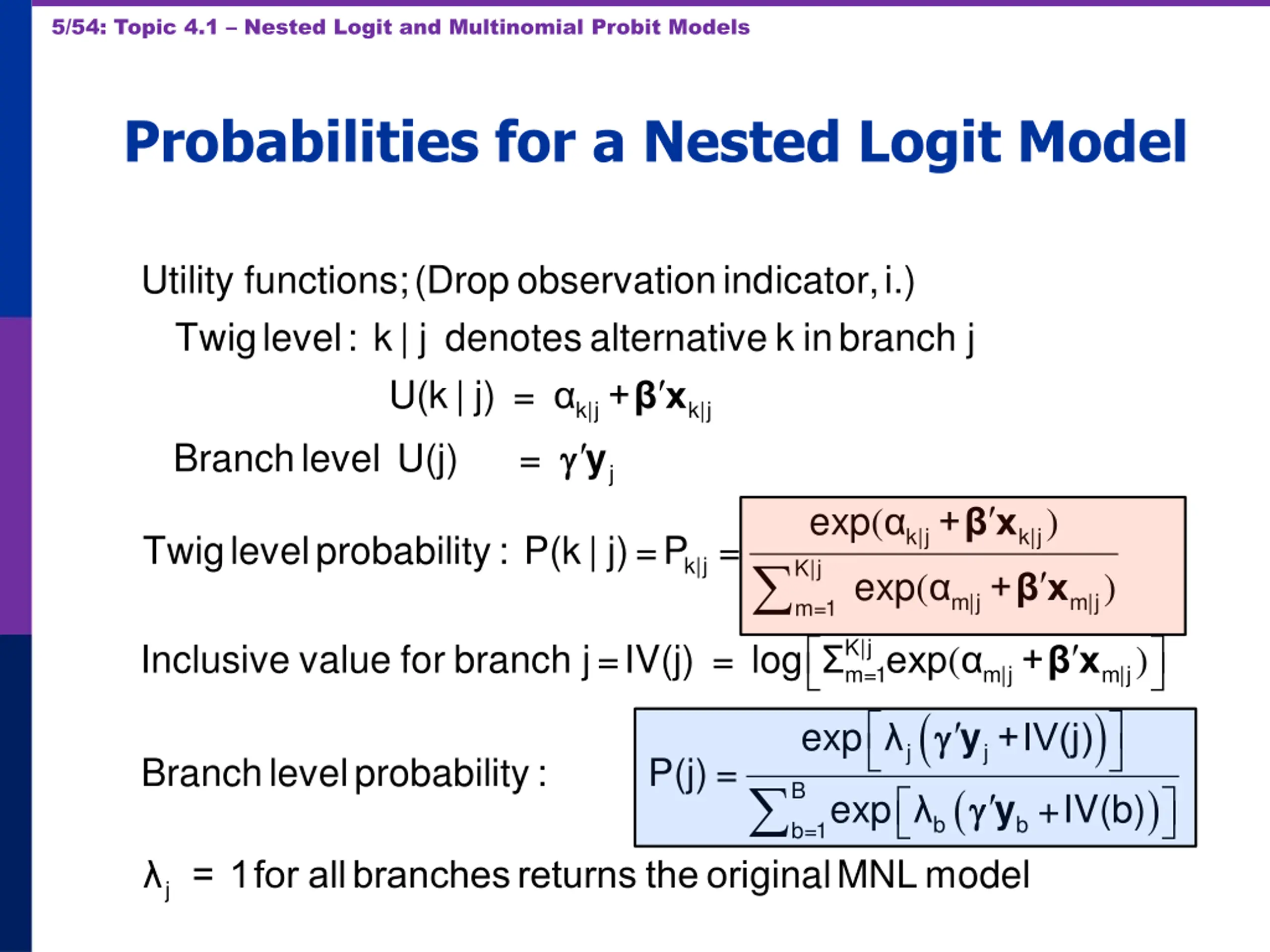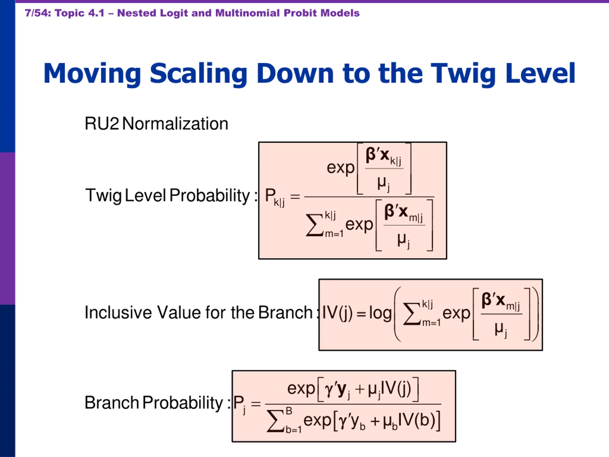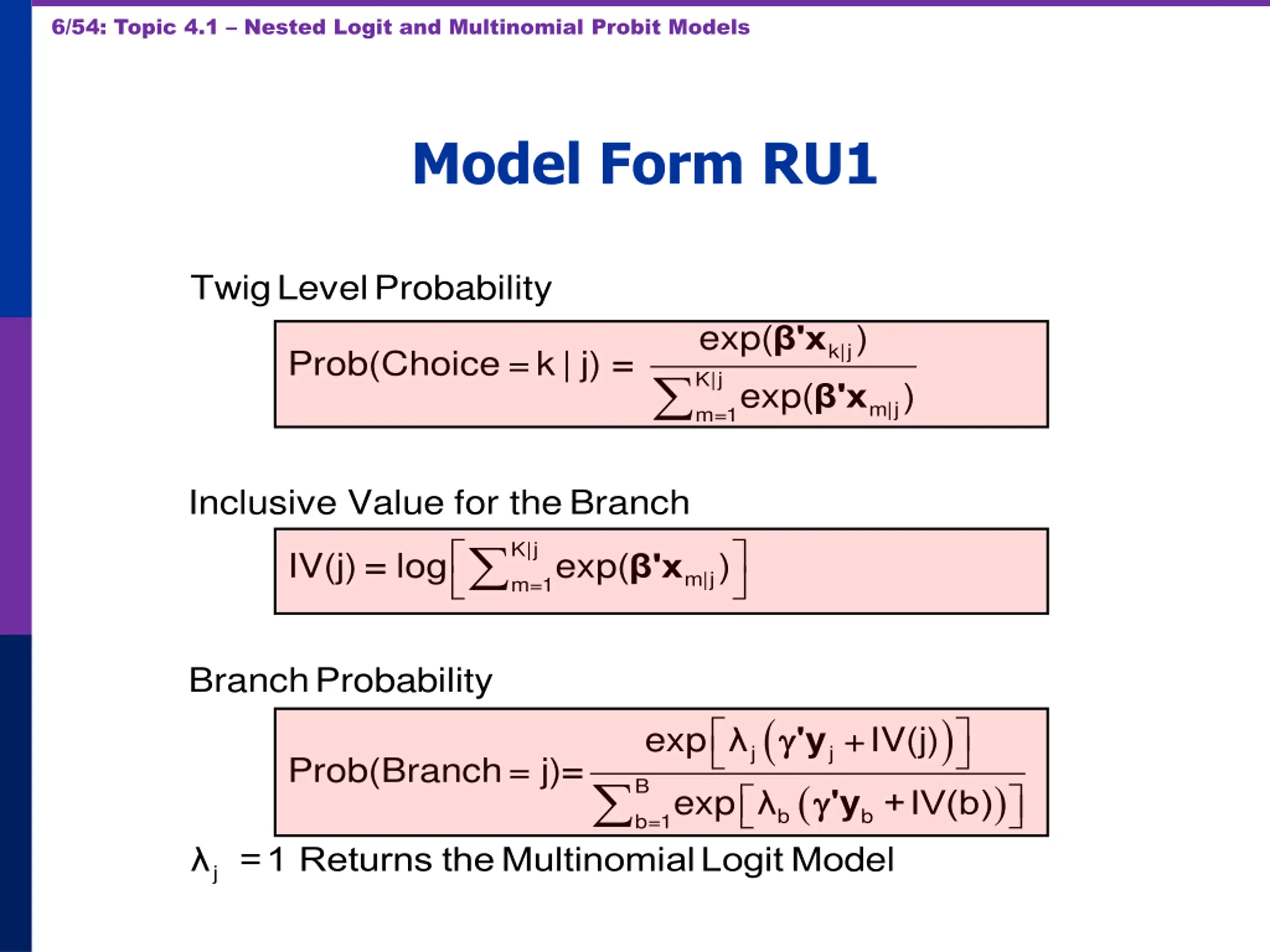 6/54: Topic 4.1 Nested Logit and Multinomial Probit Models Model Form RU1 Twig Level Probability exp( ) 'x k|j Prob(Choice =k| j) = K|j exp( ) 'x m|j m=1 Inclusive Value for the Branch K|j IV(j) log exp( ) = 'x m|j m=1 Branch Probability ( ) exp +IV(j) 'y j j Prob(Branch= j) = ( ) B exp 'y +IV(b) b b b=1 = 1 Returns the Multinomial Logit Model j