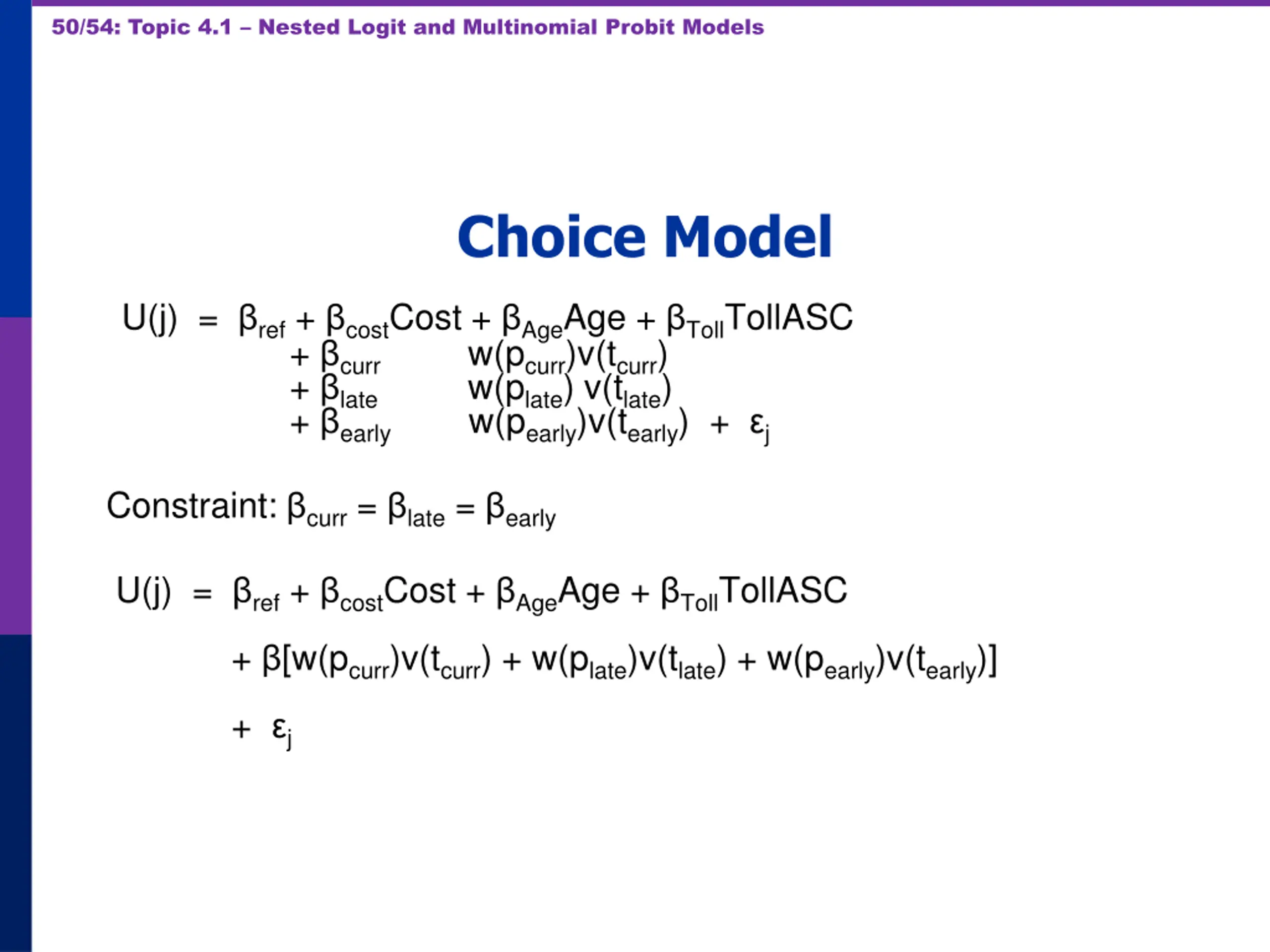 50/54: Topic 4.1 Nested Logit and Multinomial Probit Models Choice Model U(j) = ref + costCost + AgeAge + TollTollASC + curr w(pcurr)v(tcurr) + late w(plate) v(tlate) + early w(pearly)v(tearly) + j Constraint: curr = late = early U(j) = ref + costCost + AgeAge + TollTollASC + [w(pcurr)v(tcurr) + w(plate)v(tlate) + w(pearly)v(tearly)] + j