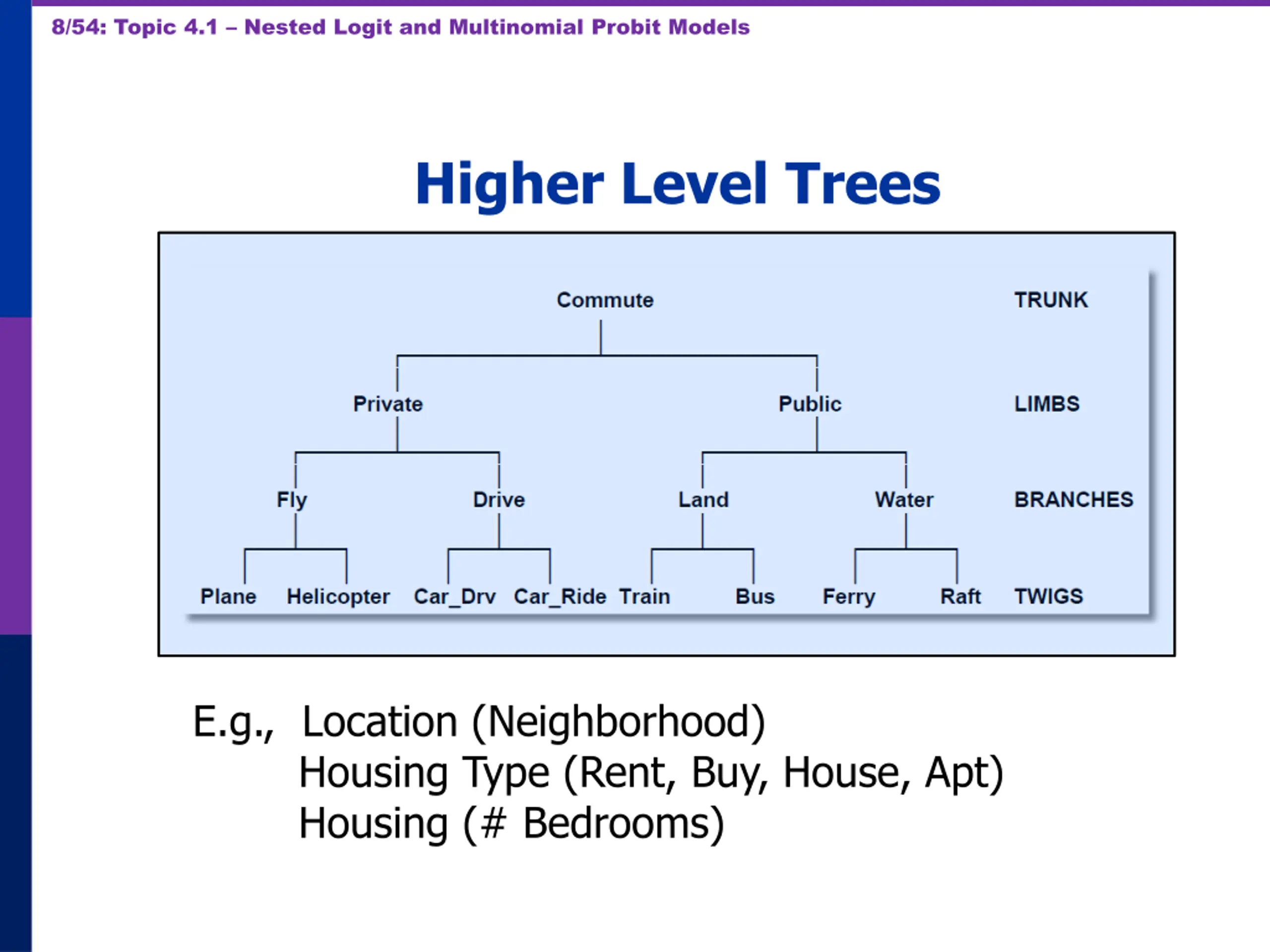 8/54: Topic 4.1 Nested Logit and Multinomial Probit Models Higher Level Trees E.g., Location (Neighborhood) Housing Type (Rent, Buy, House, Apt) Housing (# Bedrooms)