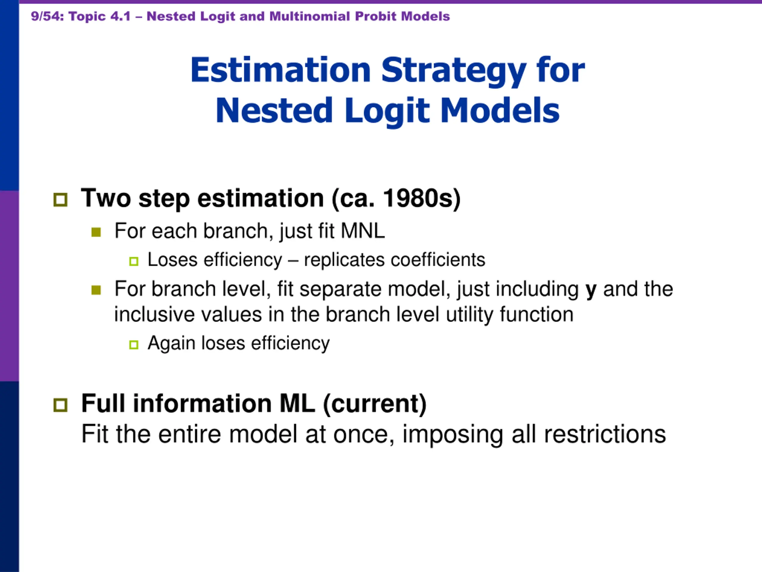 9/54: Topic 4.1 Nested Logit and Multinomial Probit Models Estimation Strategy for Nested Logit Models Two step estimation (ca. 1980s) For each branch, just fit MNL Loses efficiency replicates coefficients For branch level, fit separate model, just including y and the inclusive values in the branch level utility function Again loses efficiency Full information ML (current) Fit the entire model at once, imposing all restrictions