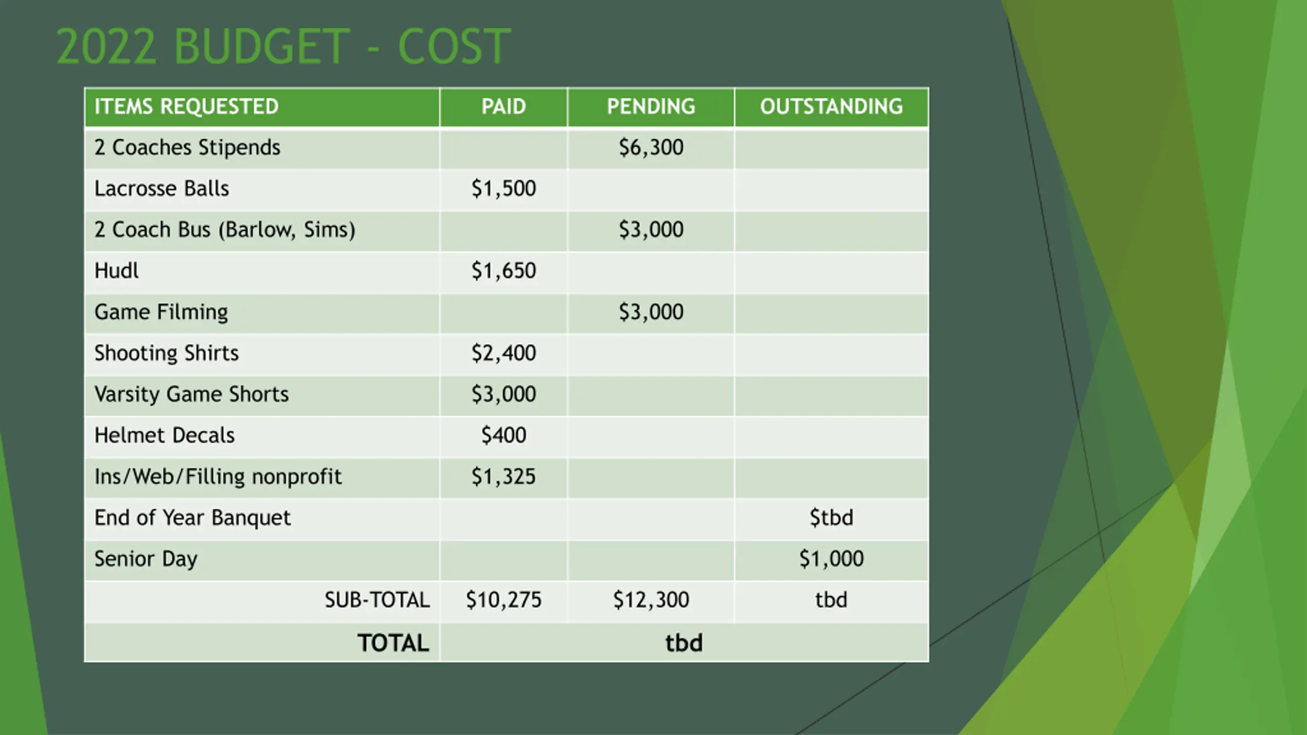 2022 BUDGET - COST ITEMS REQUESTED PAID PENDING OUTSTANDING 2 Coaches Stipends $6,300 Lacrosse Balls $1,500 2 Coach Bus (Barlow, Sims) $3,000 Hudl $1,650 Game Filming $3,000 Shooting Shirts $2,400 Varsity Game Shorts $3,000 Helmet Decals $400 Ins/Web/Filling nonprofit $1,325 End of Year Banquet $tbd Senior Day $1,000 SUB-TOTAL $10,275 $12,300 tbd TOTAL tbd