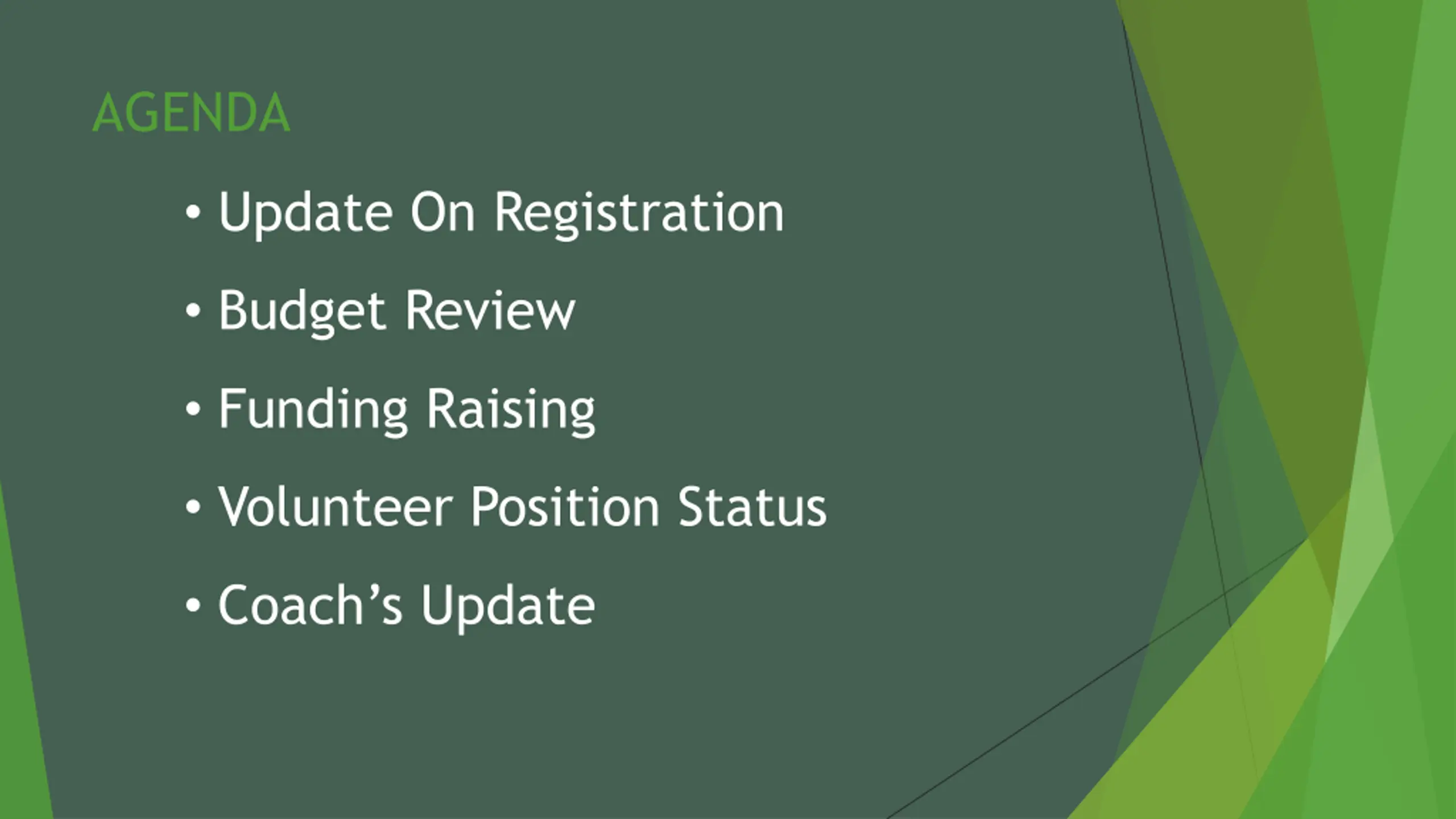 AGENDA Update On Registration Budget Review Funding Raising Volunteer Position Status Coach s Update