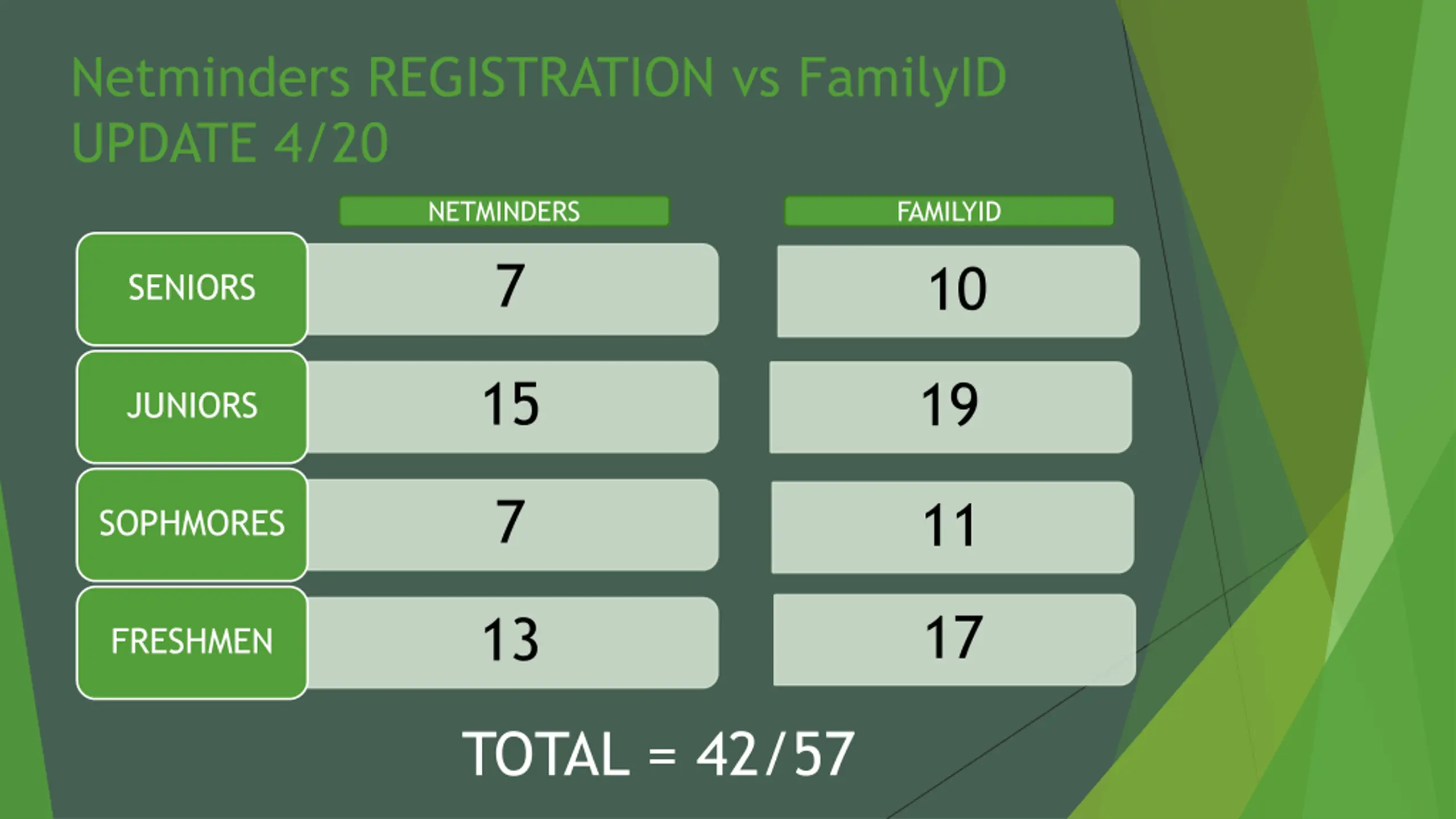 Netminders REGISTRATION vs FamilyID UPDATE 4/20 NETMINDERS FAMILYID 10 7 SENIORS 15 19 JUNIORS 7 11 SOPHMORES 17 13 FRESHMEN TOTAL = 42/57