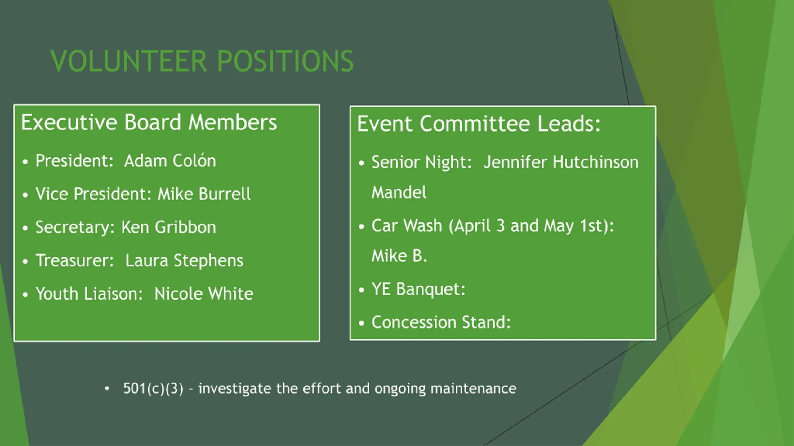 VOLUNTEER POSITIONS Executive Board Members Event Committee Leads: President: Adam Col n Senior Night: Jennifer Hutchinson Mandel Vice President: Mike Burrell Car Wash (April 3 and May 1st): Secretary: Ken Gribbon Mike B. Treasurer: Laura Stephens YE Banquet: Youth Liaison: Nicole White Concession Stand: 501(c)(3) investigate the effort and ongoing maintenance