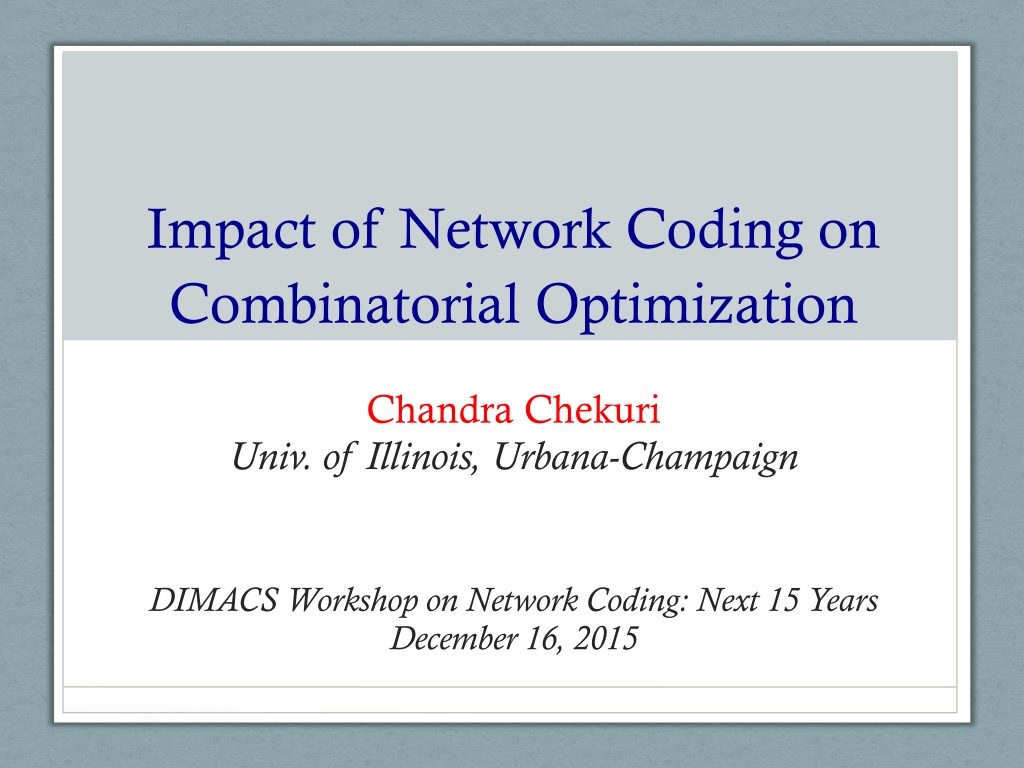Impact of Network Coding on Combinatorial Optimization Chandra Chekuri Univ. of Illinois, Urbana-Champaign DIMACS Workshop on Network Coding: Next 15 Years December 16, 2015