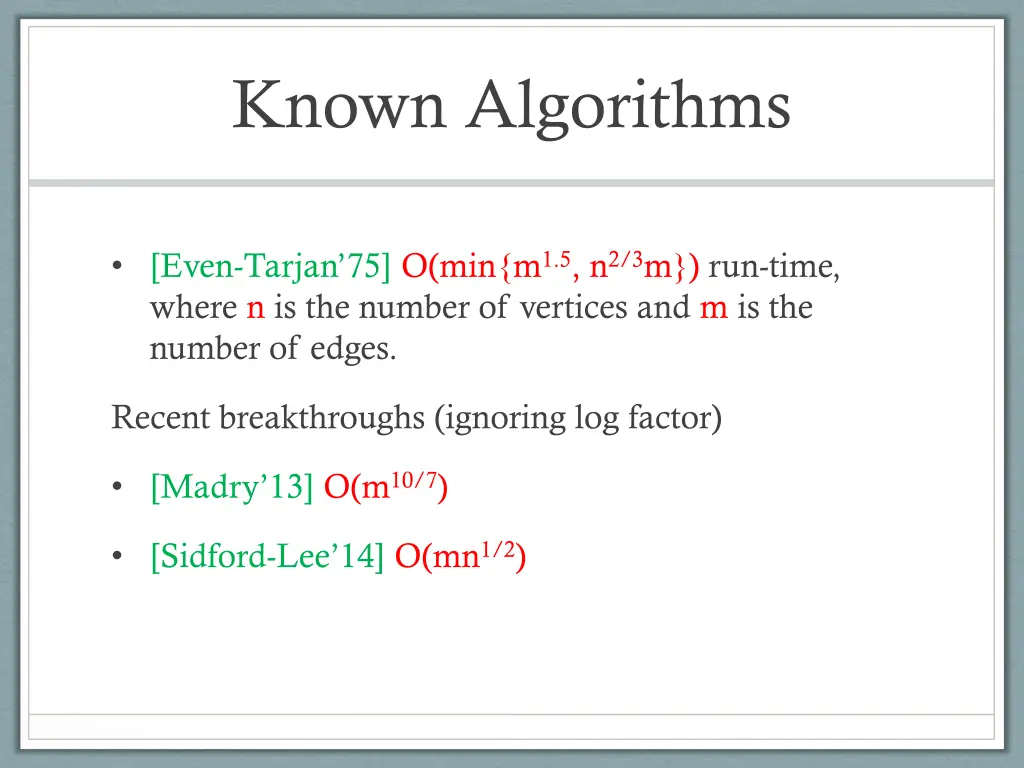 Known Algorithms [Even-Tarjan 75] O(min{m1.5, n2/3m}) run-time, where n is the number of vertices and m is the number of edges. Recent breakthroughs (ignoring log factor) [Madry 13] O(m10/7) [Sidford-Lee 14] O(mn1/2)