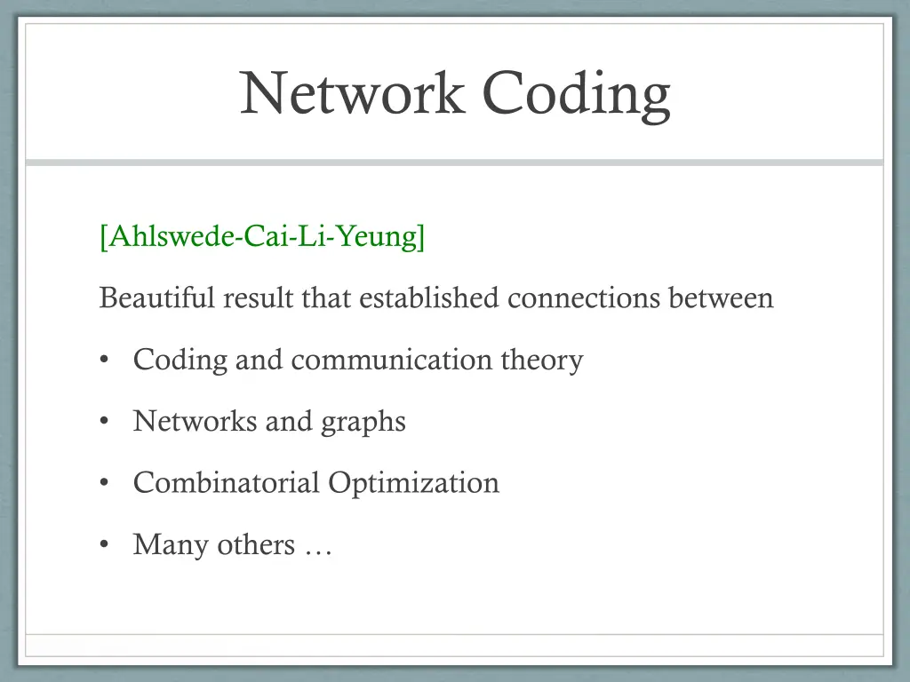 Network Coding [Ahlswede-Cai-Li-Yeung] Beautiful result that established connections between Coding and communication theory Networks and graphs Combinatorial Optimization Many others