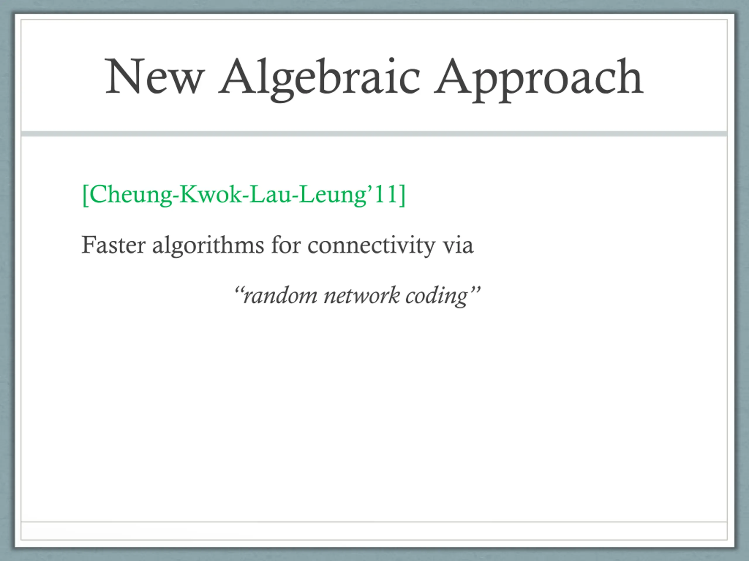 New Algebraic Approach [Cheung-Kwok-Lau-Leung 11] Faster algorithms for connectivity via random network coding