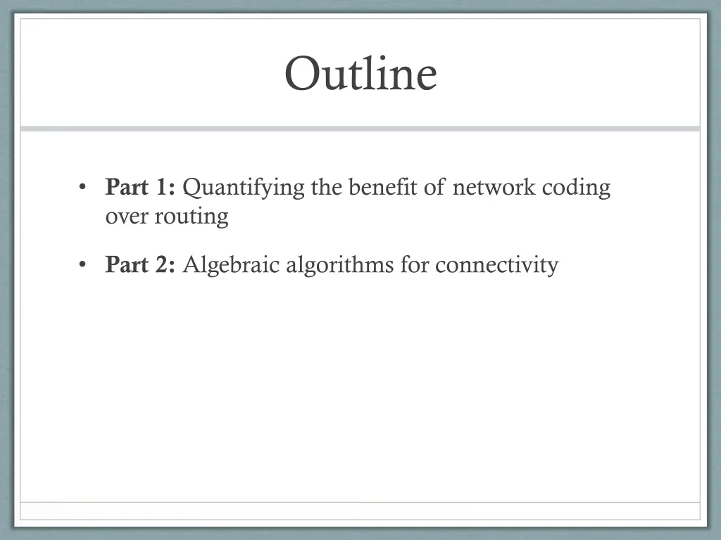 Outline Part 1: Quantifying the benefit of network coding over routing Part 2: Algebraic algorithms for connectivity