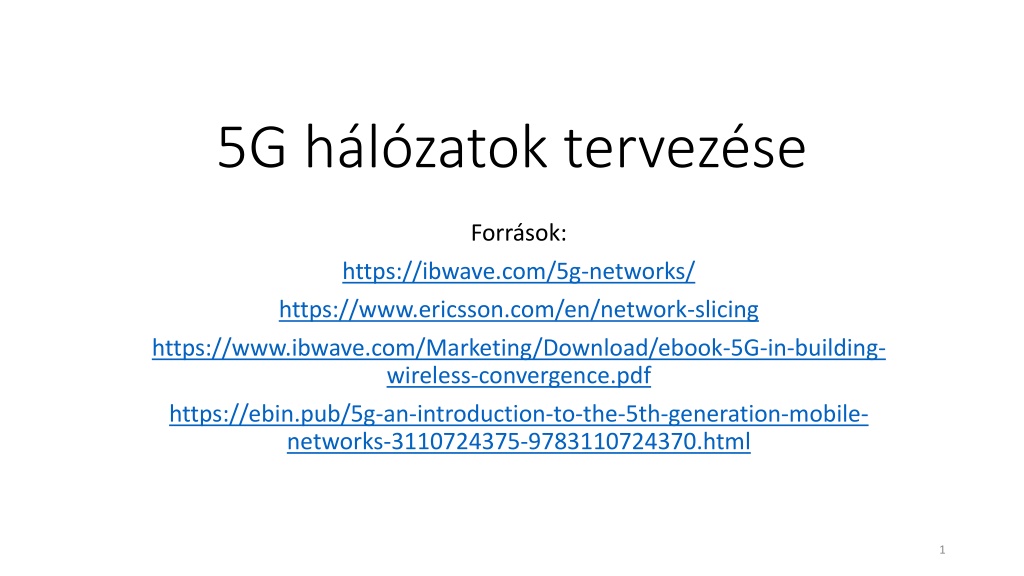 5G hlzatok tervezse Forr sok: https://ibwave.com/5g-networks/ https://www.ericsson.com/en/network-slicing https://www.ibwave.com/Marketing/Download/ebook-5G-in-building- wireless-convergence.pdf https://ebin.pub/5g-an-introduction-to-the-5th-generation-mobile- networks-3110724375-9783110724370.html 1