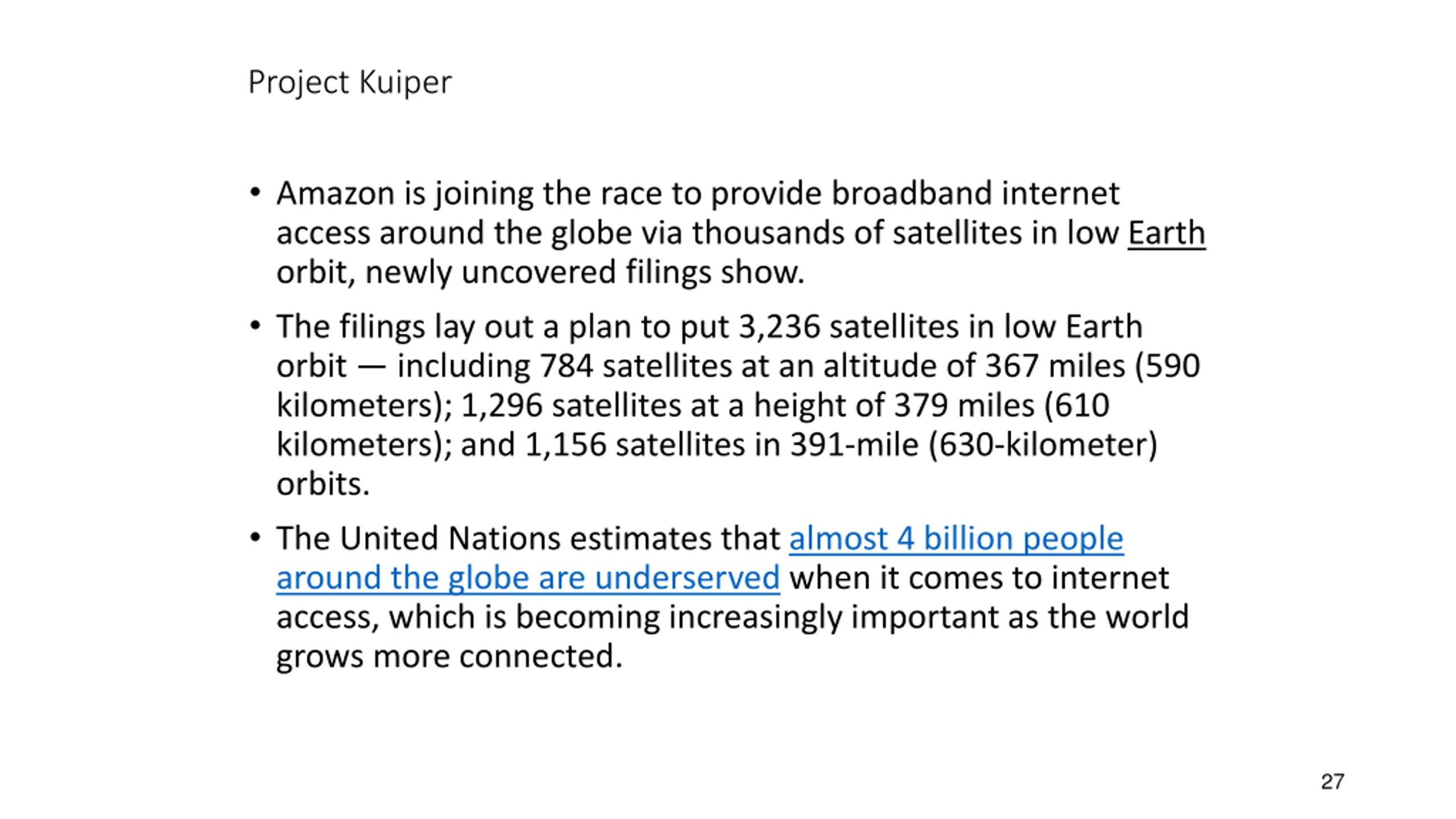 Project Kuiper Amazon is joining the race to provide broadband internet access around the globe via thousands of satellites in low Earth orbit, newly uncovered filings show. The filings lay out a plan to put 3,236 satellites in low Earth orbit including 784 satellites at an altitude of 367 miles (590 kilometers); 1,296 satellites at a height of 379 miles (610 kilometers); and 1,156 satellites in 391-mile (630-kilometer) orbits. The United Nations estimates that almost 4 billion people around the globe are underserved when it comes to internet access, which is becoming increasingly important as the world grows more connected. 27