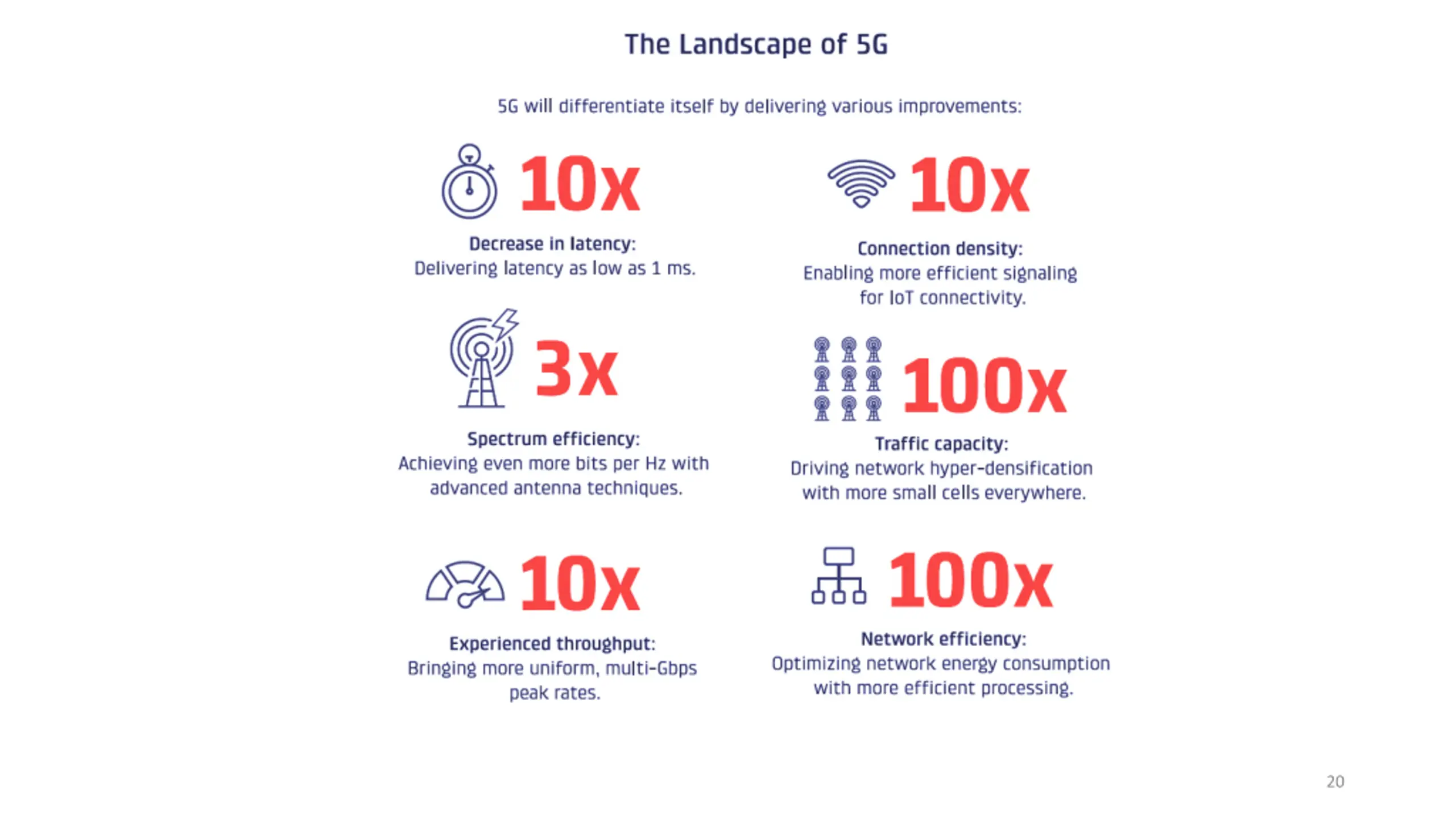 Flexibility with network slicing and Bandwidth Parts (BWP) Whether you plan to use 5G to connect gadgets through the internet of things or just want it for high-speed video streaming, network slicing allows you to designate specific streams depending on the purpose of your wireless infrastructure. Unlike designing for 4G, you can assign up to four channels with different use-cases for 5G networks. See Ericsson video to understanding network slicing! https://www.ericsson.com/en/network-slicing Massive IoT with high density of smart devices. Not only will 5G enable these fantastic features, it will also eliminate some of the common complaints of using legacy networks (4G and earlier). 5G will solve issues that have plagued existing technologies for years, such as pixelated video calls, long buffer times for streamed movies, and delays between uploading and sharing content. 19