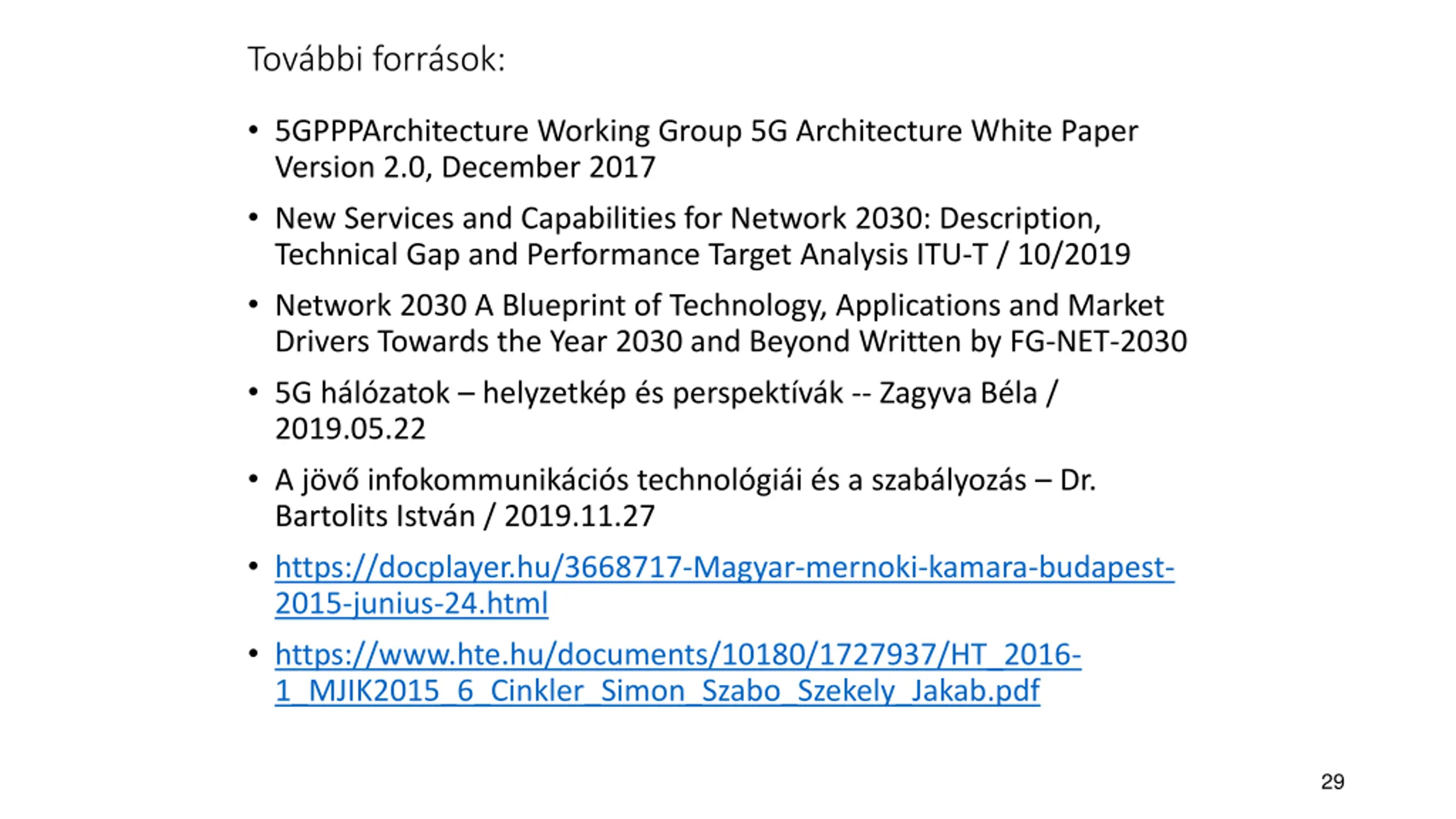 Tovbbi forrsok: 5GPPPArchitecture Working Group 5G Architecture White Paper Version 2.0, December 2017 New Services and Capabilities for Network 2030: Description, Technical Gap and Performance Target Analysis ITU-T / 10/2019 Network 2030 A Blueprint of Technology, Applications and Market Drivers Towards the Year 2030 and Beyond Written by FG-NET-2030 5G h l zatok helyzetk p s perspekt v k -- Zagyva B la / 2019.05.22 A j v infokommunik ci s technol gi i s a szab lyoz s Dr. Bartolits Istv n / 2019.11.27 https://docplayer.hu/3668717-Magyar-mernoki-kamara-budapest- 2015-junius-24.html https://www.hte.hu/documents/10180/1727937/HT_2016- 1_MJIK2015_6_Cinkler_Simon_Szabo_Szekely_Jakab.pdf 29