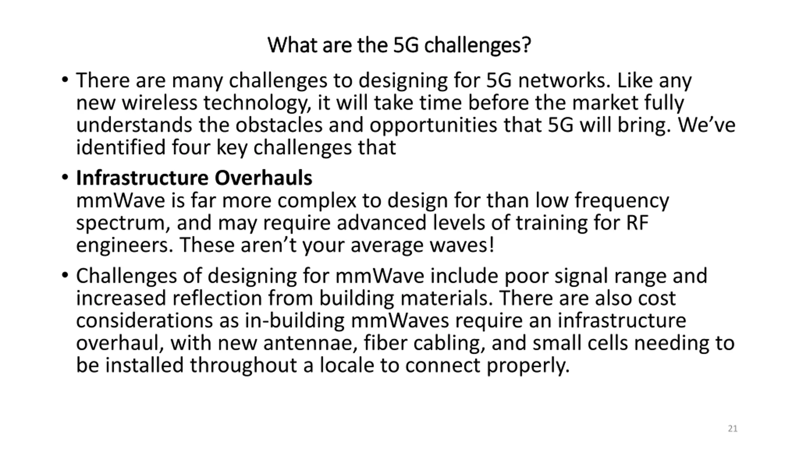 What are the 5G challenges? What are the 5G challenges? There are many challenges to designing for 5G networks. Like any new wireless technology, it will take time before the market fully understands the obstacles and opportunities that 5G will bring. We ve identified four key challenges that Infrastructure Overhauls mmWave is far more complex to design for than low frequency spectrum, and may require advanced levels of training for RF engineers. These aren t your average waves! Challenges of designing for mmWave include poor signal range and increased reflection from building materials. There are also cost considerations as in-building mmWaves require an infrastructure overhaul, with new antennae, fiber cabling, and small cells needing to be installed throughout a locale to connect properly. 21