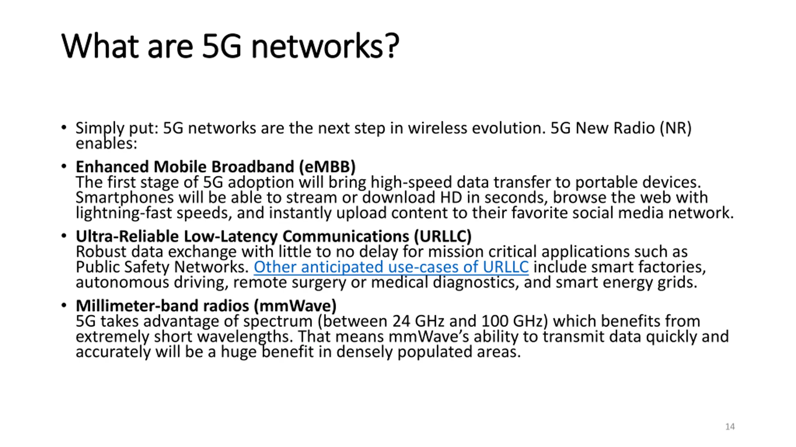 What What are are 5G 5G networks networks? ? Simply put: 5G networks are the next step in wireless evolution. 5G New Radio (NR) enables: Enhanced Mobile Broadband (eMBB) The first stage of 5G adoption will bring high-speed data transfer to portable devices. Smartphones will be able to stream or download HD in seconds, browse the web with lightning-fast speeds, and instantly upload content to their favorite social media network. Ultra-Reliable Low-Latency Communications (URLLC) Robust data exchange with little to no delay for mission critical applications such as Public Safety Networks. Other anticipated use-cases of URLLC include smart factories, autonomous driving, remote surgery or medical diagnostics, and smart energy grids. Millimeter-band radios (mmWave) 5G takes advantage of spectrum (between 24 GHz and 100 GHz) which benefits from extremely short wavelengths. That means mmWave s ability to transmit data quickly and accurately will be a huge benefit in densely populated areas. 14