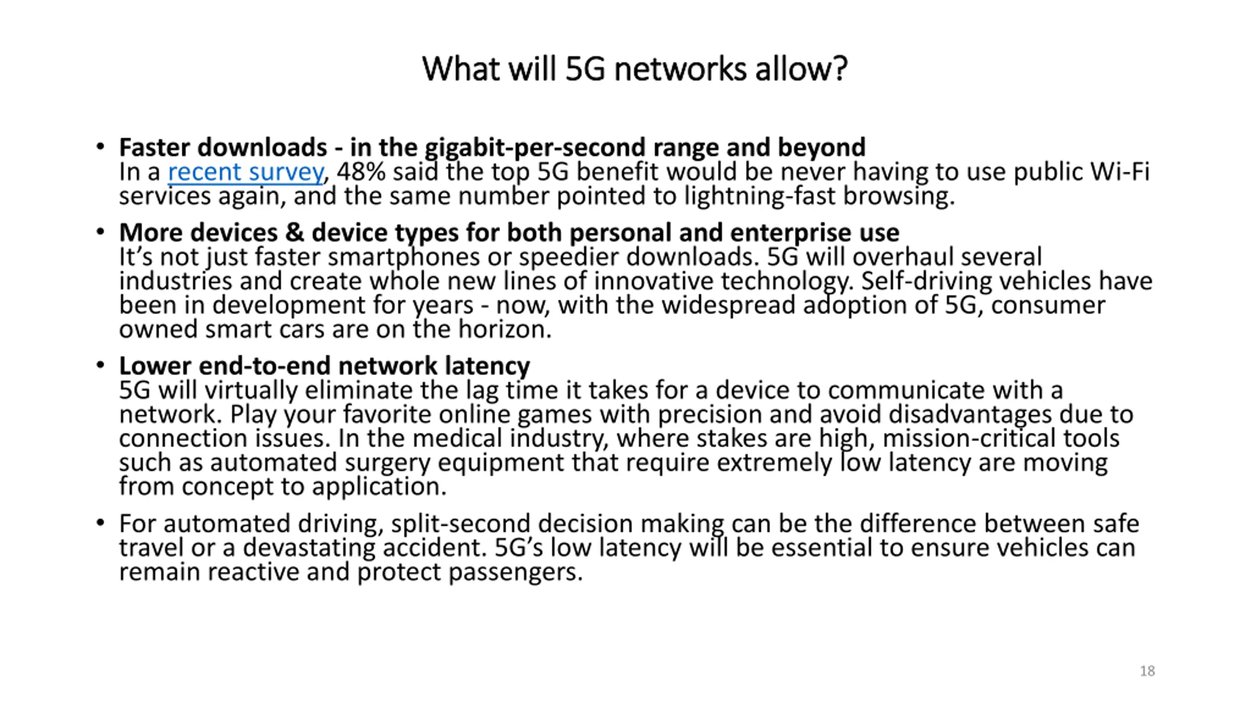 What will 5G networks allow? What will 5G networks allow? Faster downloads - in the gigabit-per-second range and beyond In a recent survey, 48% said the top 5G benefit would be never having to use public Wi-Fi services again, and the same number pointed to lightning-fast browsing. More devices & device types for both personal and enterprise use It s not just faster smartphones or speedier downloads. 5G will overhaul several industries and create whole new lines of innovative technology. Self-driving vehicles have been in development for years - now, with the widespread adoption of 5G, consumer owned smart cars are on the horizon. Lower end-to-end network latency 5G will virtually eliminate the lag time it takes for a device to communicate with a network. Play your favorite online games with precision and avoid disadvantages due to connection issues. In the medical industry, where stakes are high, mission-critical tools such as automated surgery equipment that require extremely low latency are moving from concept to application. For automated driving, split-second decision making can be the difference between safe travel or a devastating accident. 5G s low latency will be essential to ensure vehicles can remain reactive and protect passengers. 18