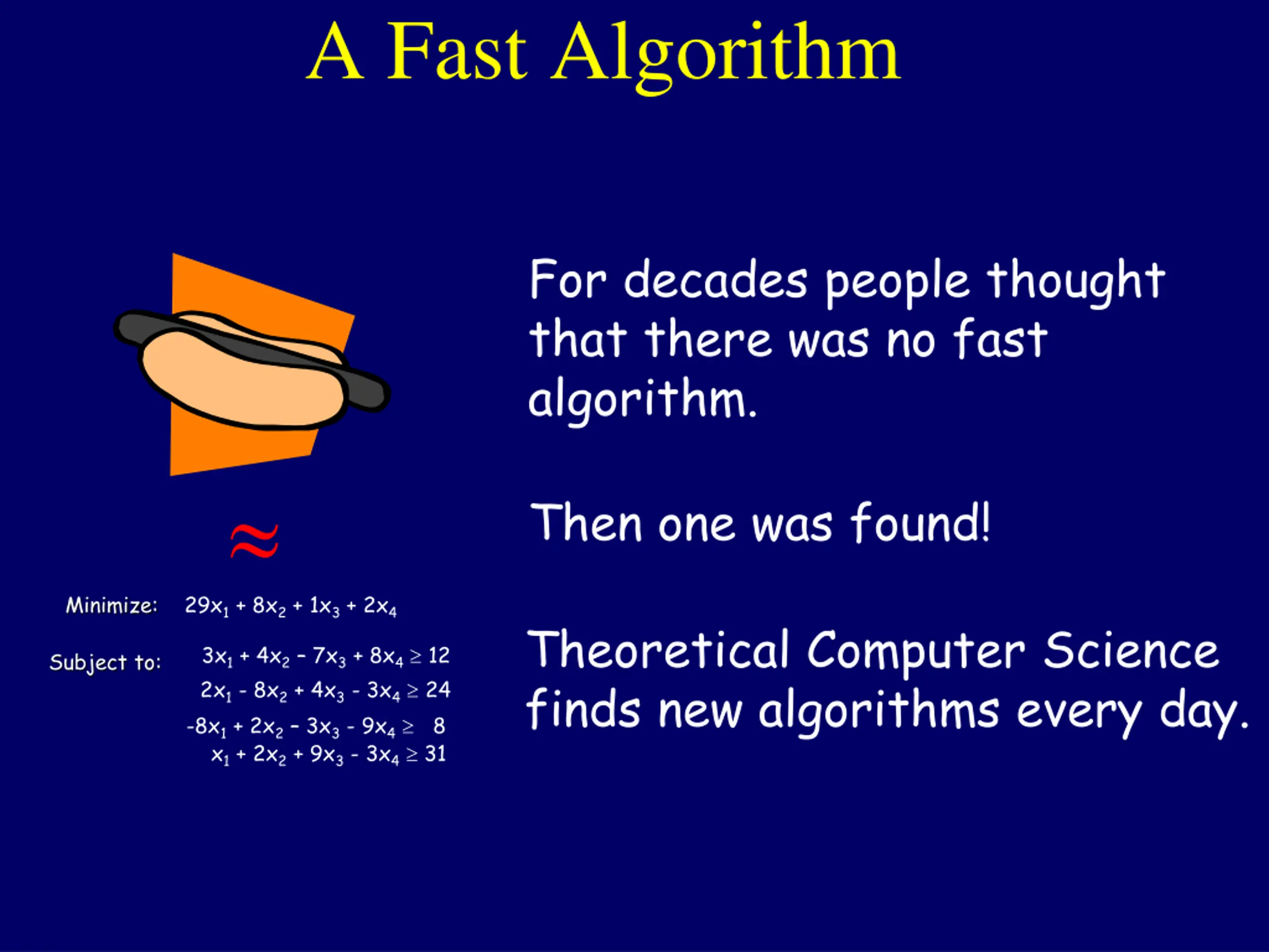A Fast Algorithm For decades people thought that there was no fast algorithm. Minimize: Then one was found! 29x1 + 8x2 + 1x3 + 2x4 Theoretical Computer Science finds new algorithms every day. 3x1 + 4x2 7x3 + 8x4 12 2x1 - 8x2 + 4x3 - 3x4 24 -8x1 + 2x2 3x3 - 9x4 8 x1 + 2x2 + 9x3 - 3x4 31 Subject to: