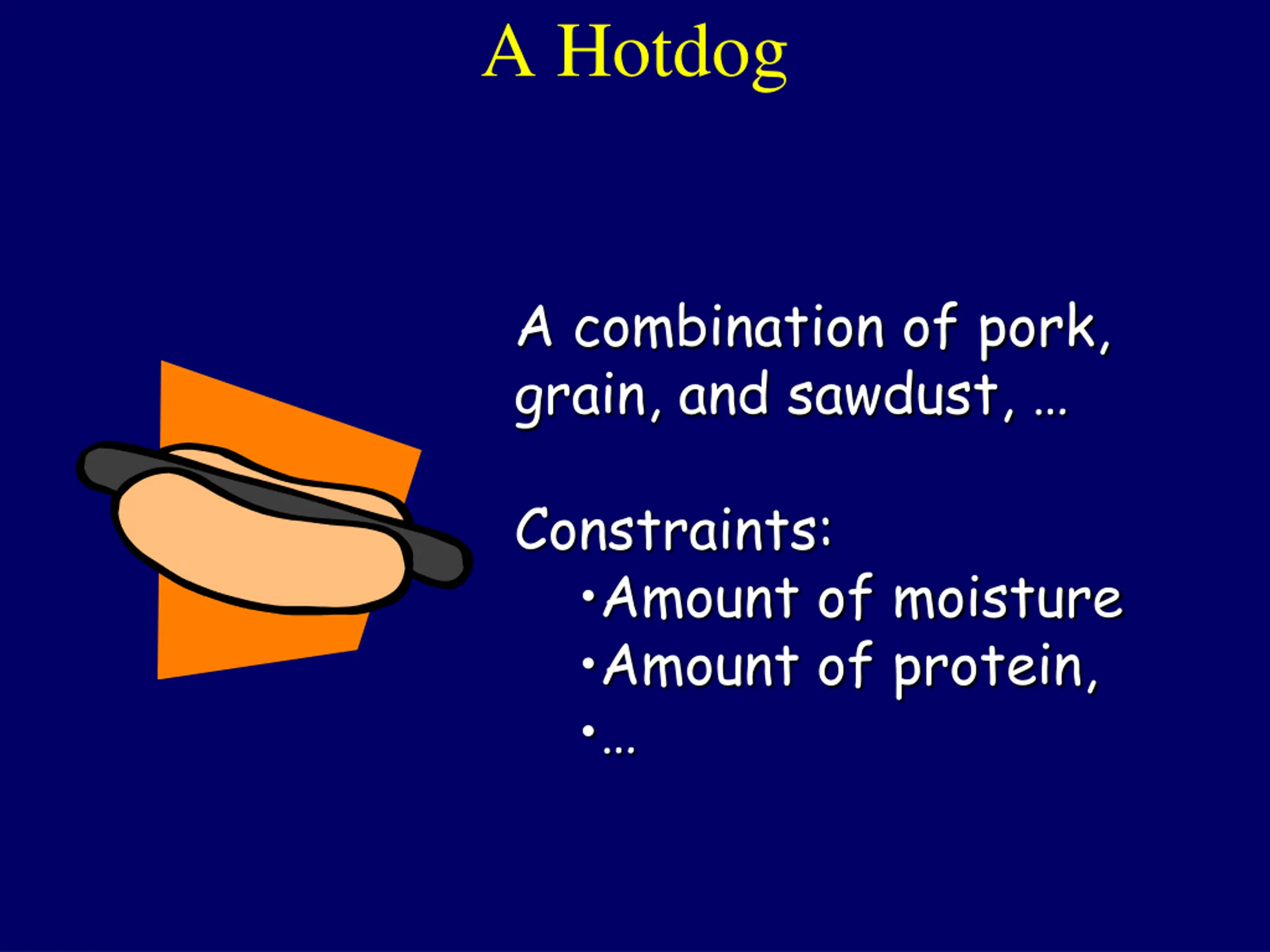 A Hotdog A combination of pork, grain, and sawdust, Constraints: Amount of moisture Amount of protein,