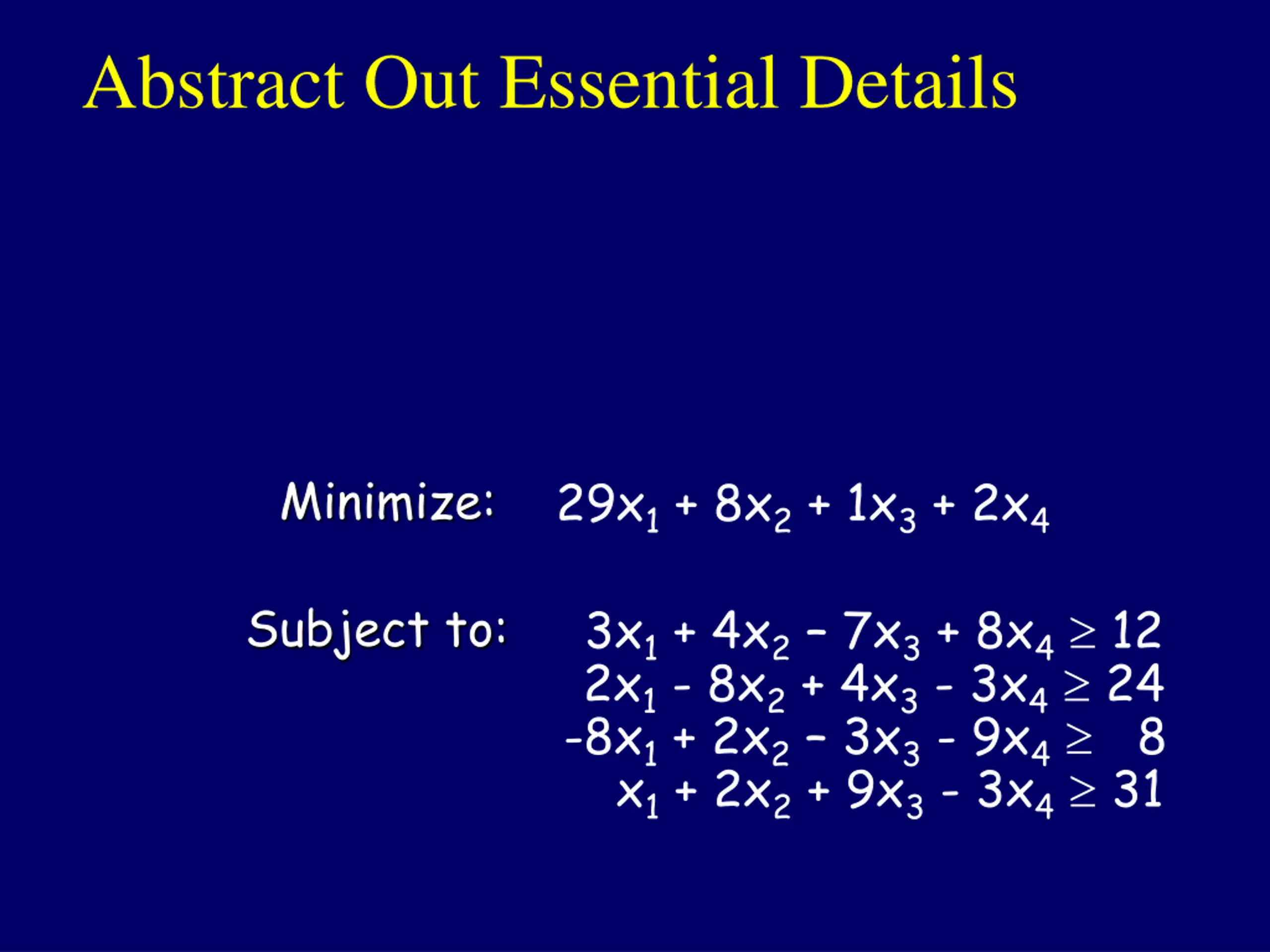 Abstract Out Essential Details Minimize: 29x1 + 8x2 + 1x3 + 2x4 Subject to: 3x1 + 4x2 7x3 + 8x4 12 2x1 - 8x2 + 4x3 - 3x4 24 -8x1 + 2x2 3x3 - 9x4 8 x1 + 2x2 + 9x3 - 3x4 31