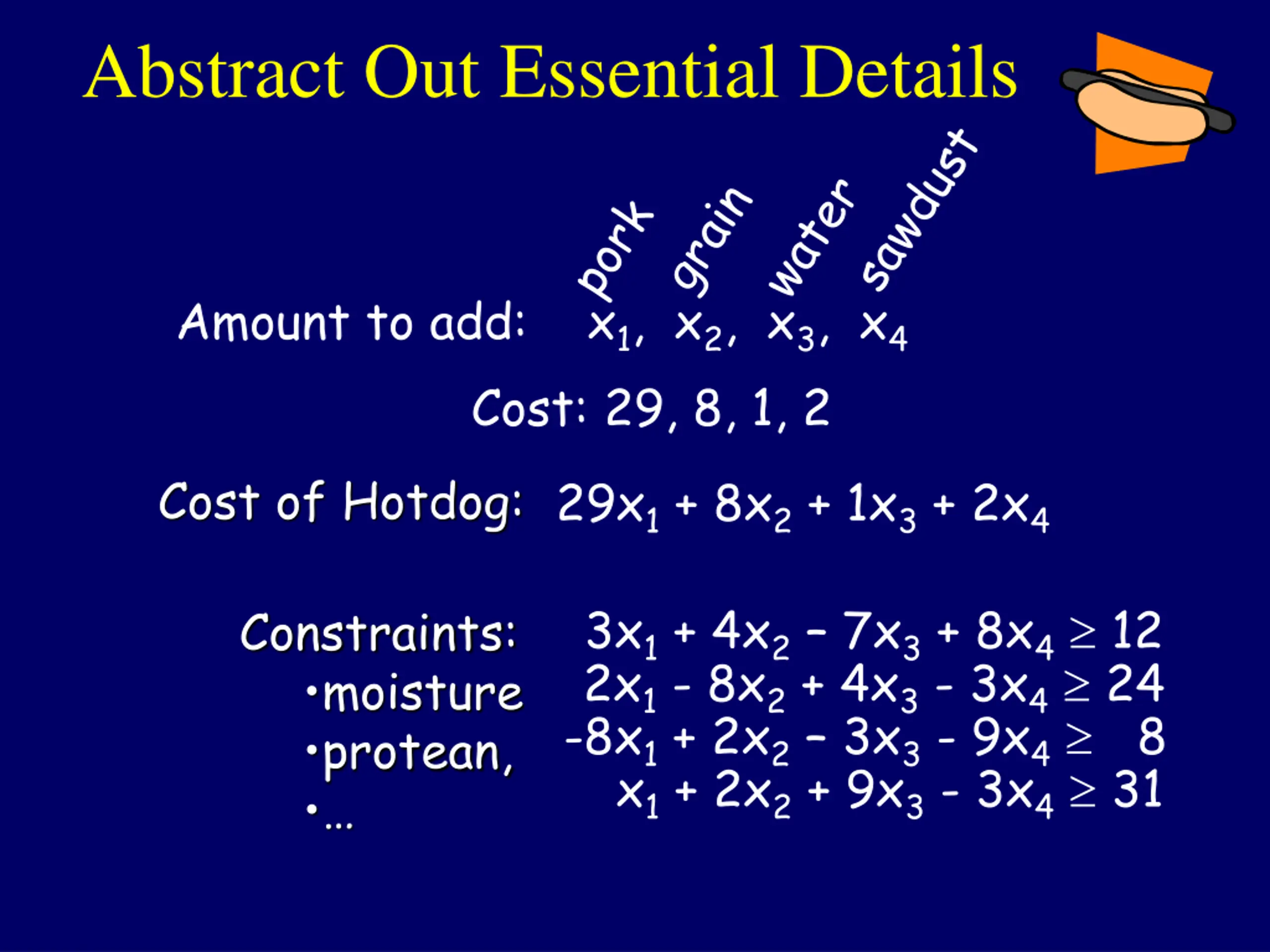 Abstract Out Essential Details Amount to add: x1, x2, x3, x4 Cost: 29, 8, 1, 2 Cost of Hotdog: 29x1 + 8x2 + 1x3 + 2x4 3x1 + 4x2 7x3 + 8x4 12 2x1 - 8x2 + 4x3 - 3x4 24 -8x1 + 2x2 3x3 - 9x4 8 x1 + 2x2 + 9x3 - 3x4 31 Constraints: moisture protean,