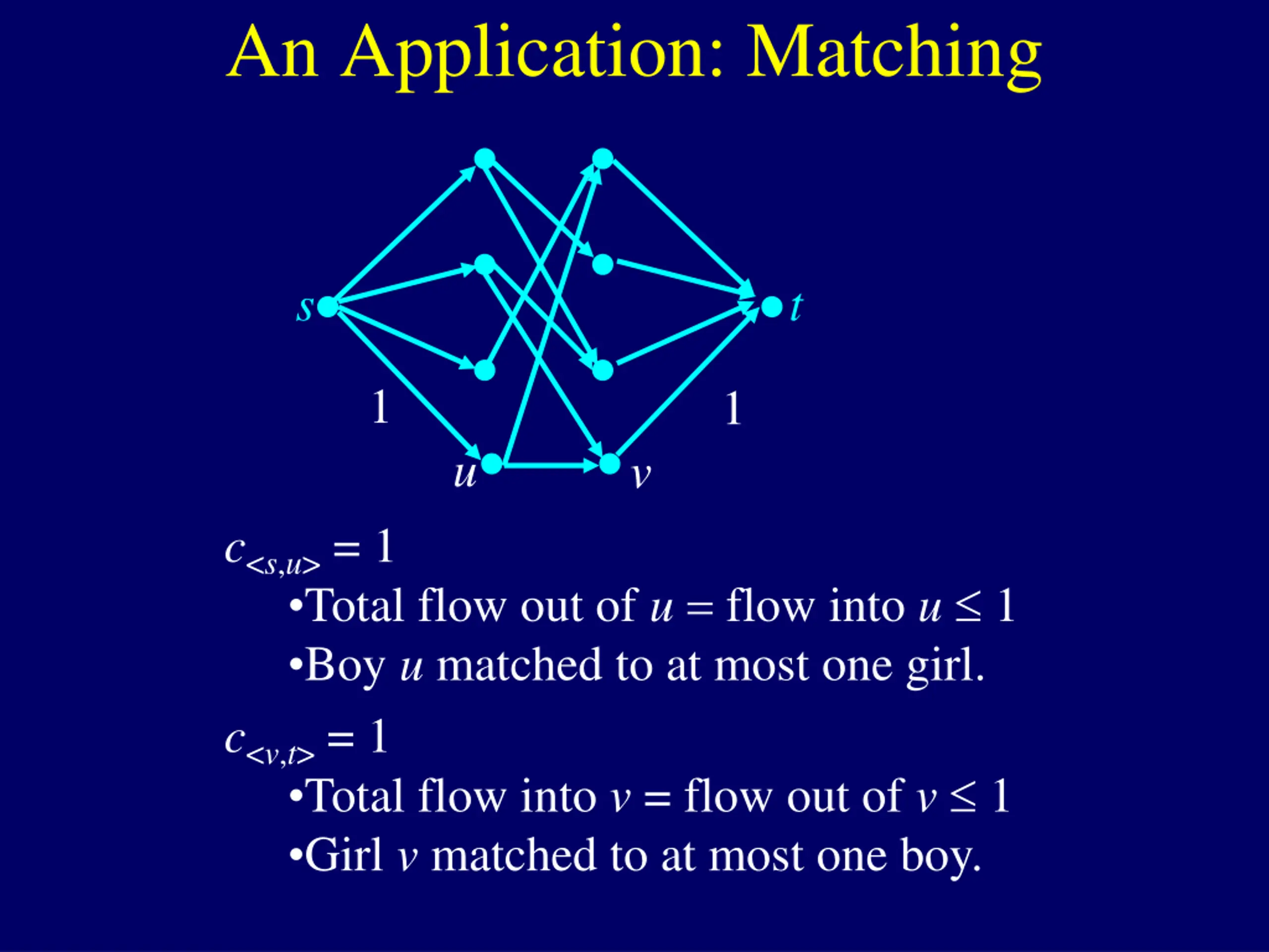 An Application: Matching s t 1 1 u v c<s,u> = 1 Total flow out of u= flow into u 1 Boy u matched to at most one girl. c<v,t> = 1 Total flow into v = flow out of v 1 Girl v matched to at most one boy.