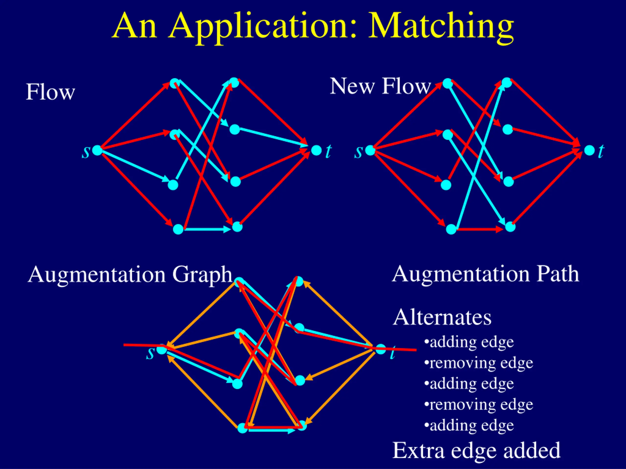 An Application: Matching New Flow Flow s t s t Augmentation Path Augmentation Graph Alternates adding edge removing edge adding edge removing edge adding edge Extra edge added s t