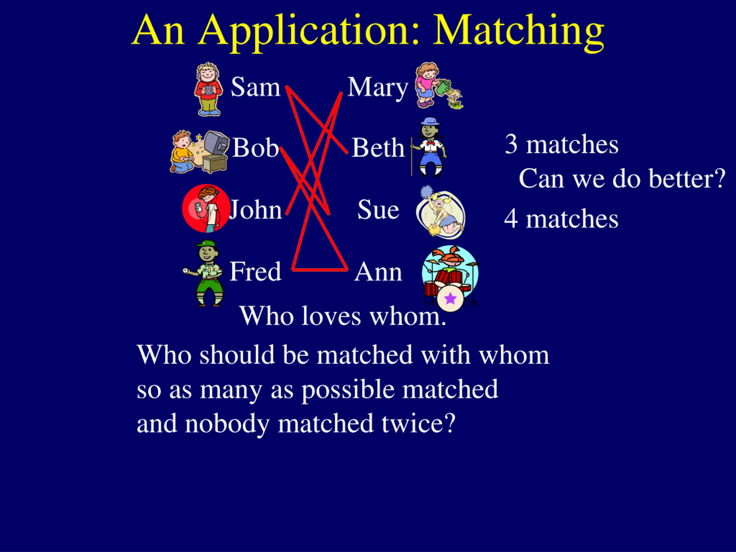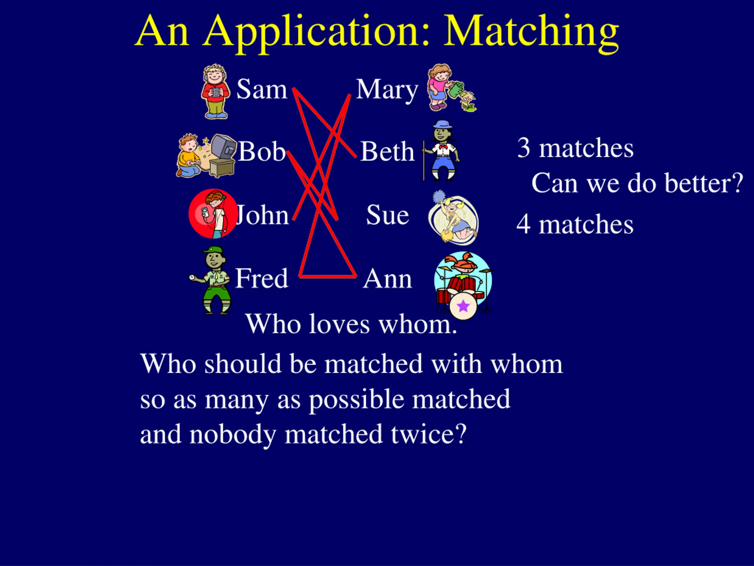 An Application: Matching Sam Mary 3 matches Can we do better? 4 matches Bob Beth John Sue Fred Who loves whom. Who should be matched with whom so as many as possible matched and nobody matched twice? Ann