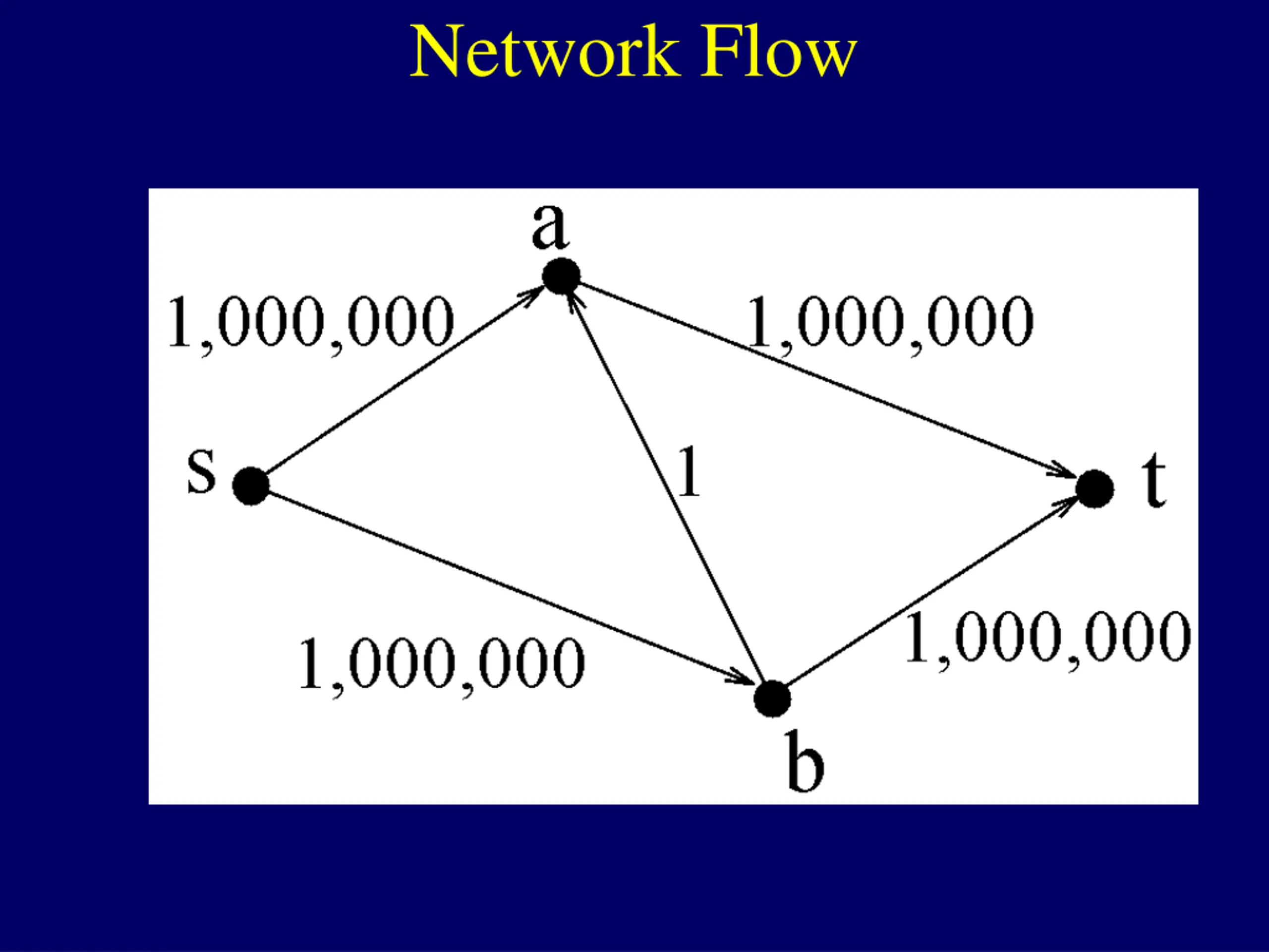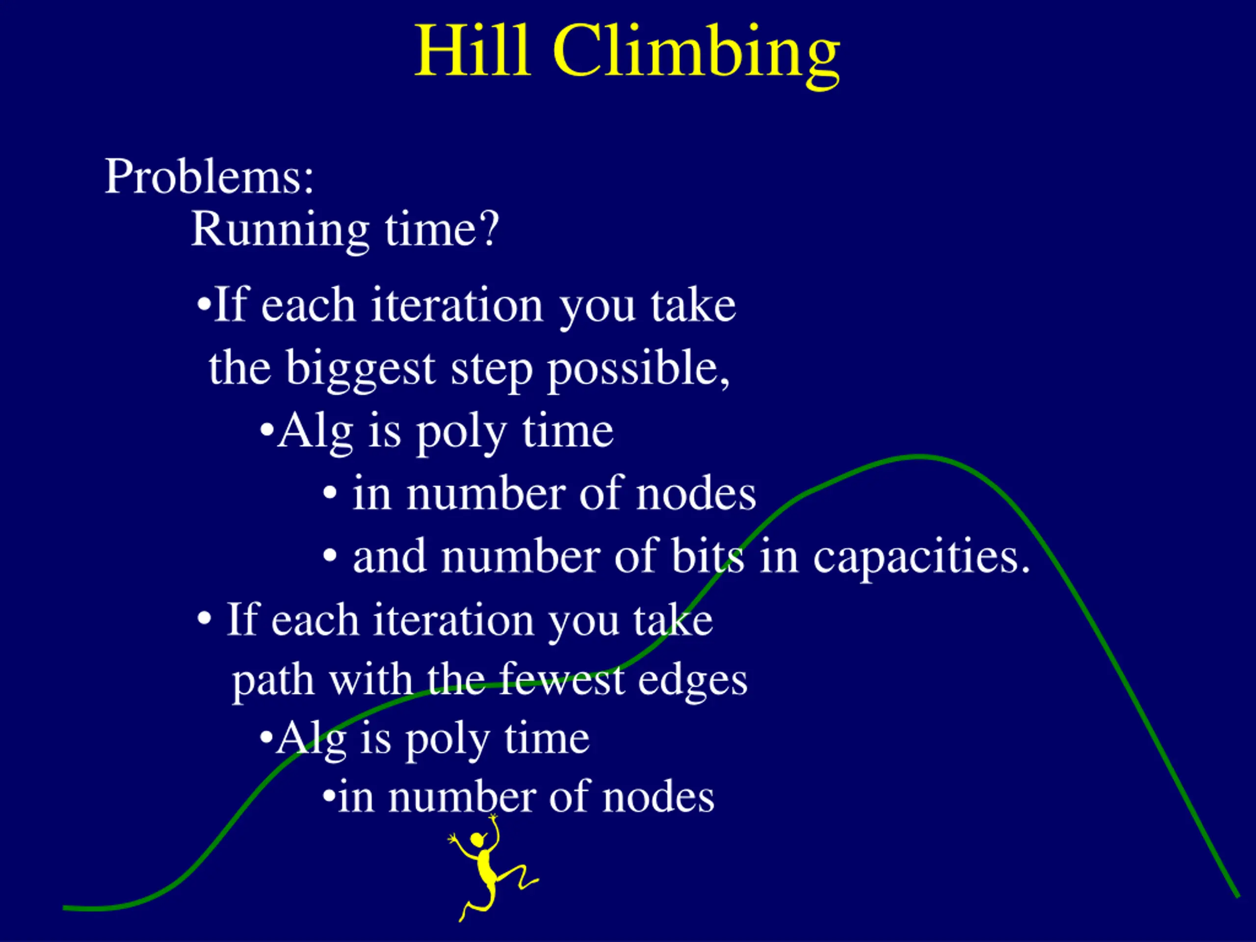 Hill Climbing Problems: Running time? If each iteration you take the biggest step possible, Alg is poly time in number of nodes and number of bits in capacities. If each iteration you take path with the fewest edges Alg is poly time in number of nodes