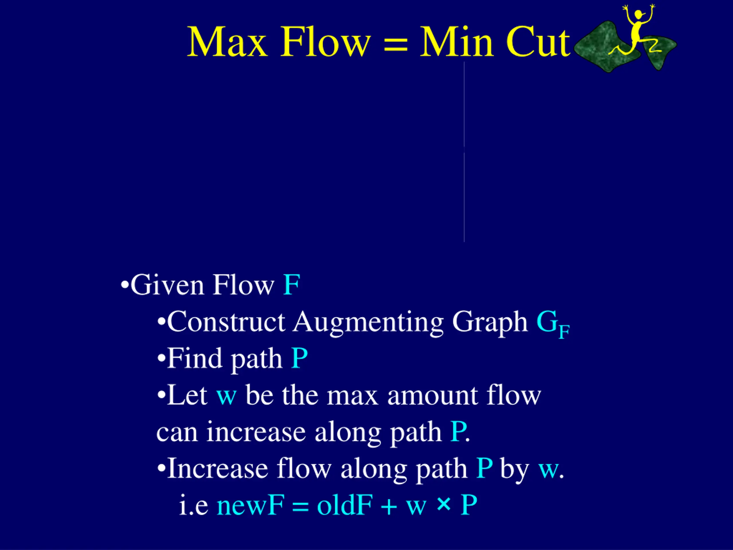Max Flow = Min Cut +w +w -w +w Given Flow F Construct Augmenting Graph GF Find path P Let w be the max amount flow can increase along path P. Increase flow along path P by w. i.e newF = oldF + w P