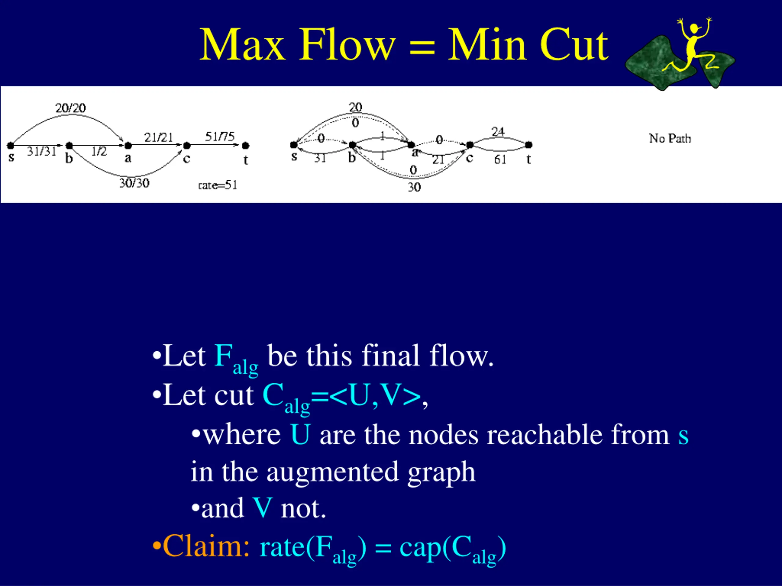 Max Flow = Min Cut Let Falg be this final flow. Let cut Calg=<U,V>, where U are the nodes reachable from s in the augmented graph and V not. Claim: rate(Falg) = cap(Calg)