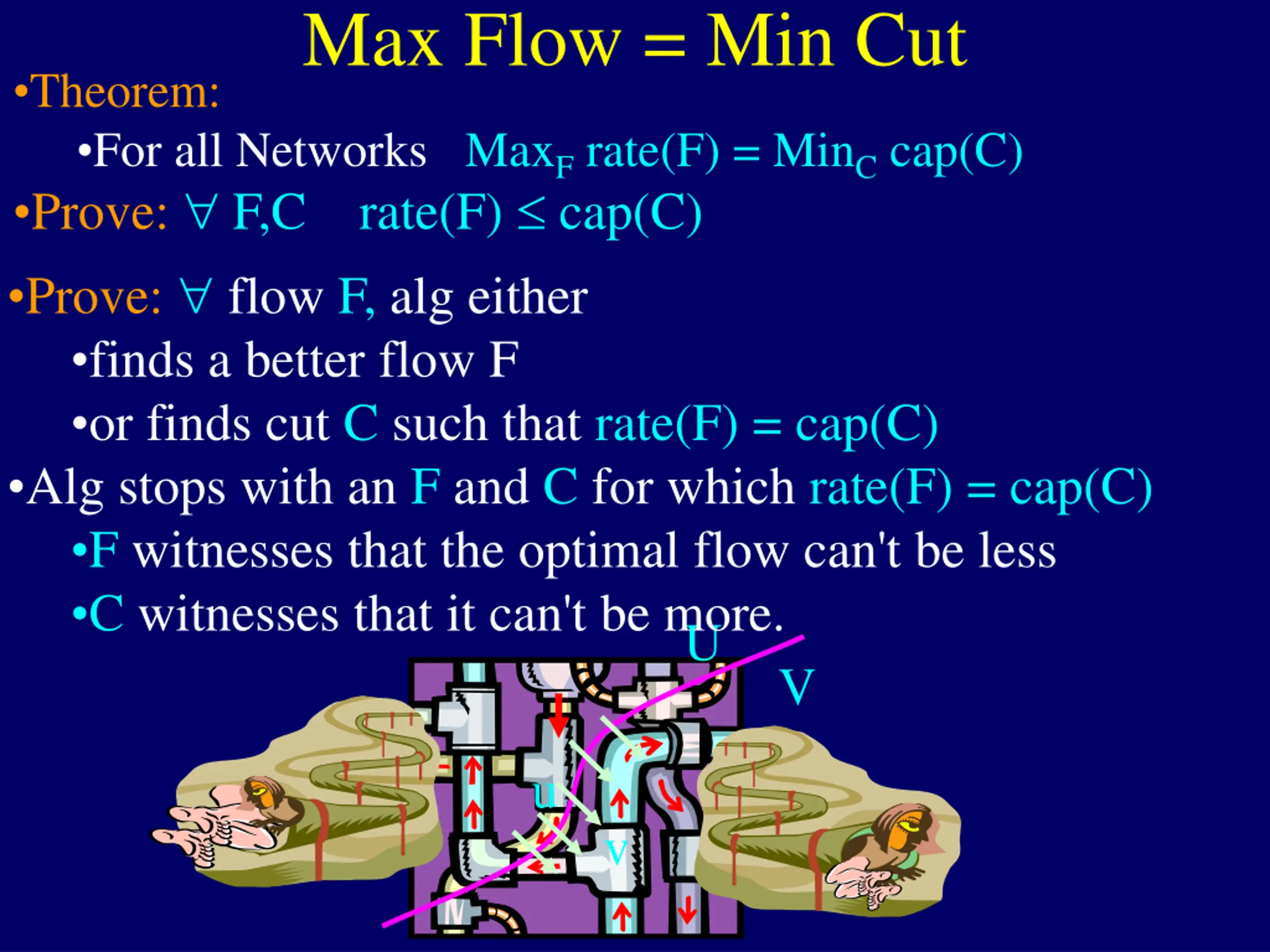 Max Flow = Min Cut Theorem: For all Networks MaxF rate(F) = MinC cap(C) Prove: F,C rate(F) cap(C) Prove: flow F, alg either finds a better flow F or finds cut C such that rate(F) = cap(C) Alg stops with an F and C for which rate(F) = cap(C) F witnesses that the optimal flow can't be less C witnesses that it can't be more. U V u v