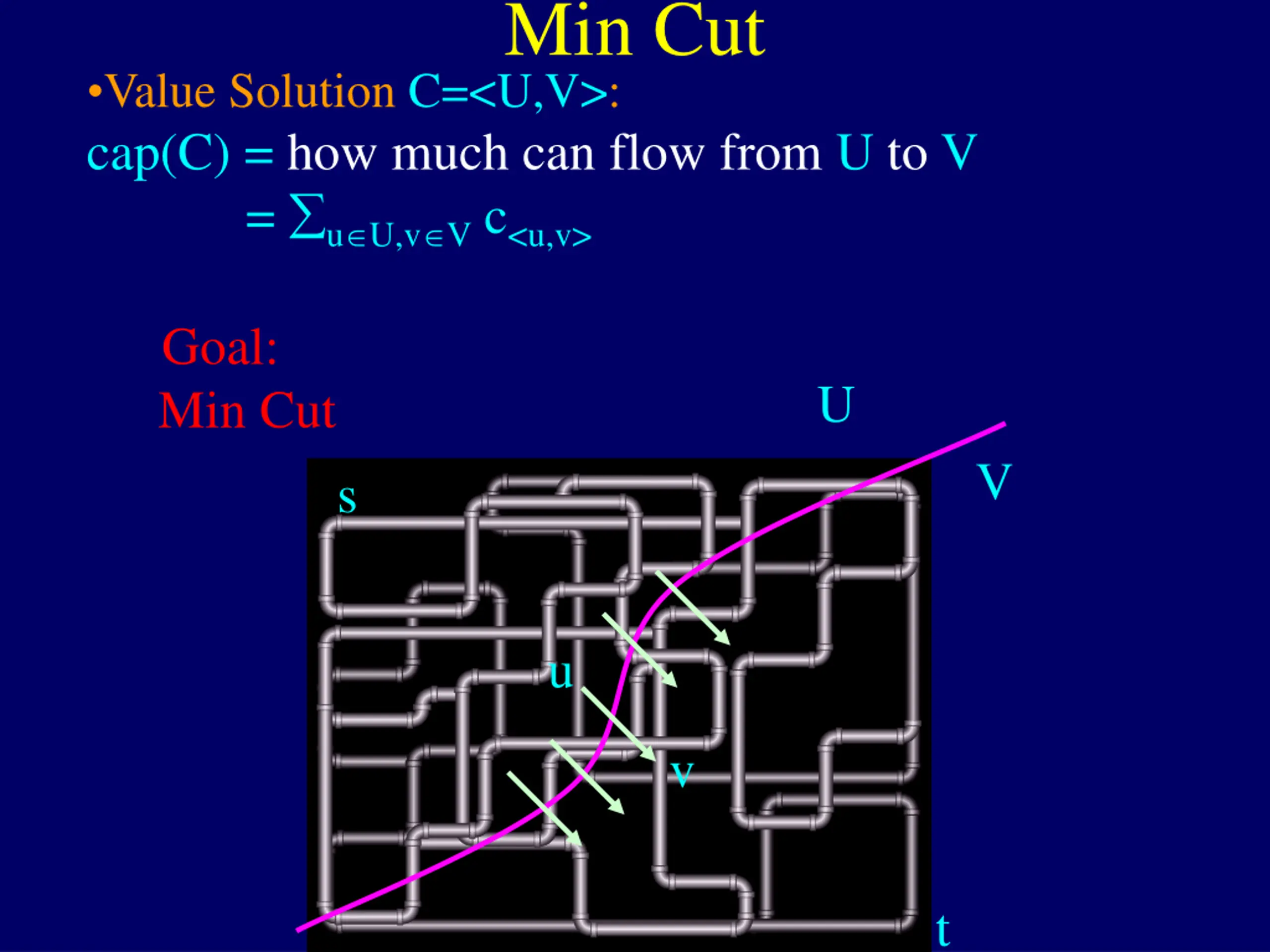 Min Cut Value Solution C=<U,V>: cap(C) = how much can flow from U to V = u U,v V c<u,v> Goal: Min Cut U V s u v t