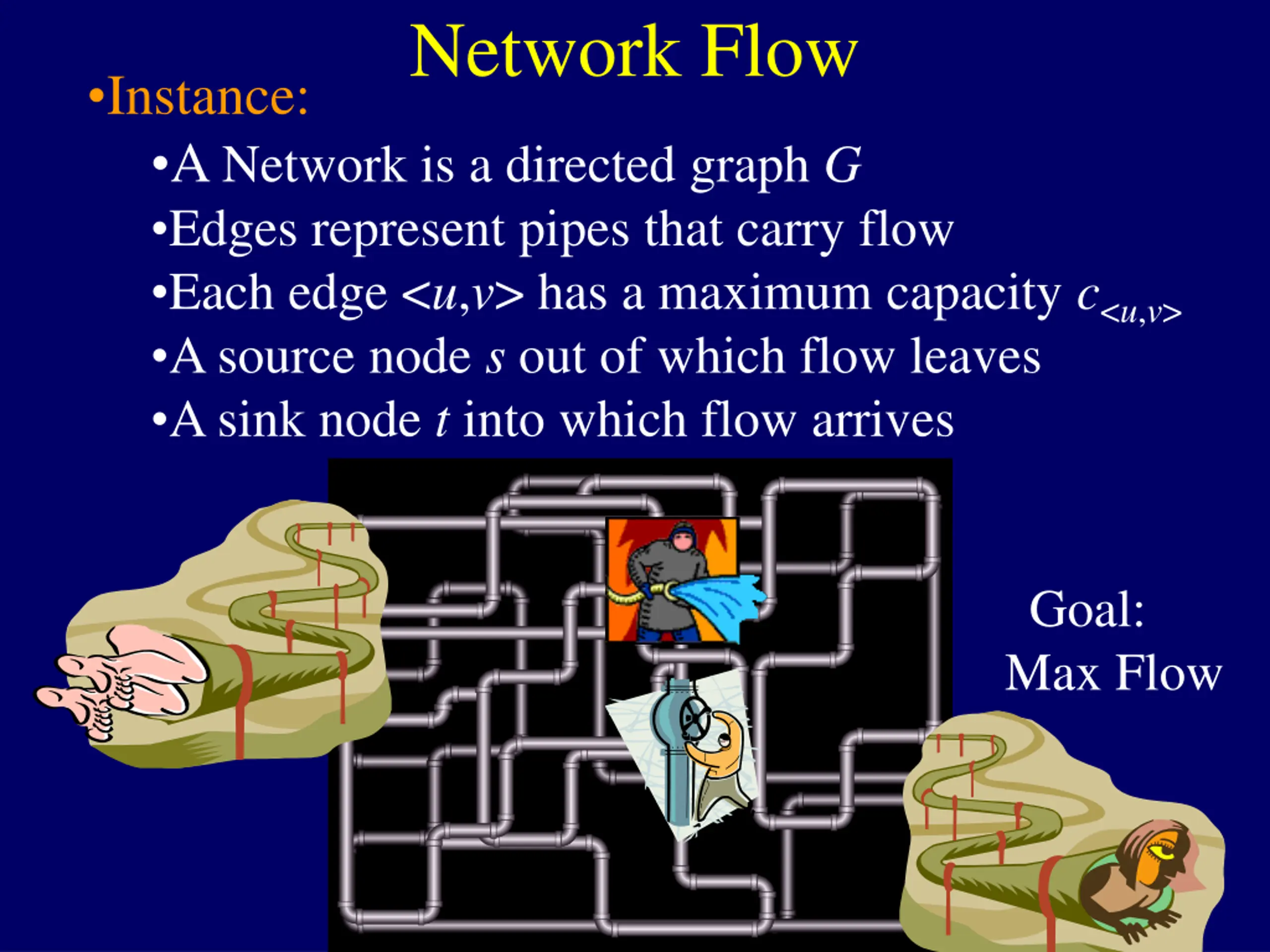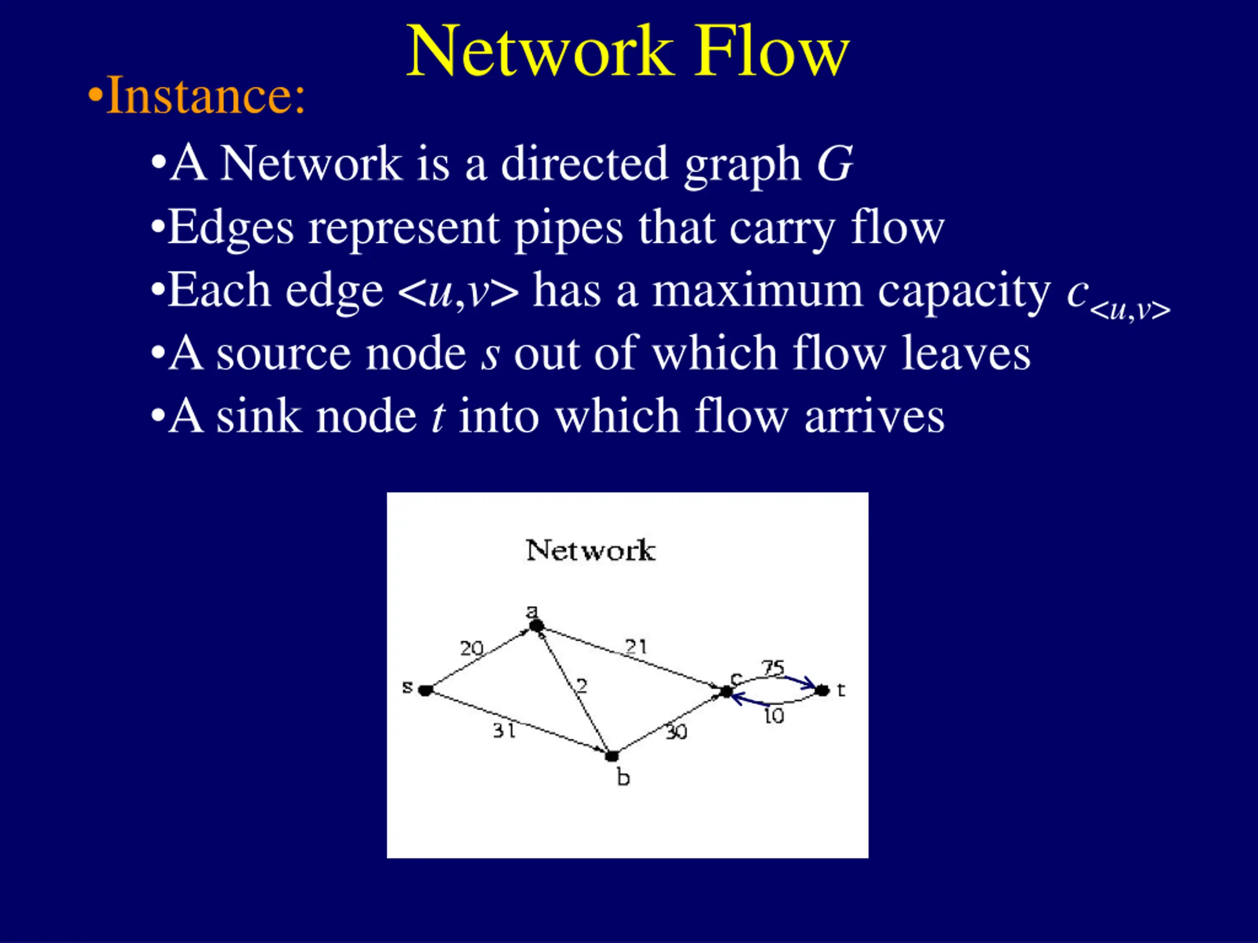 Network Flow Instance: A Network is a directed graph G Edges represent pipes that carry flow Each edge <u,v> has a maximum capacity c<u,v> A source node s out of which flow leaves A sink node t into which flow arrives
