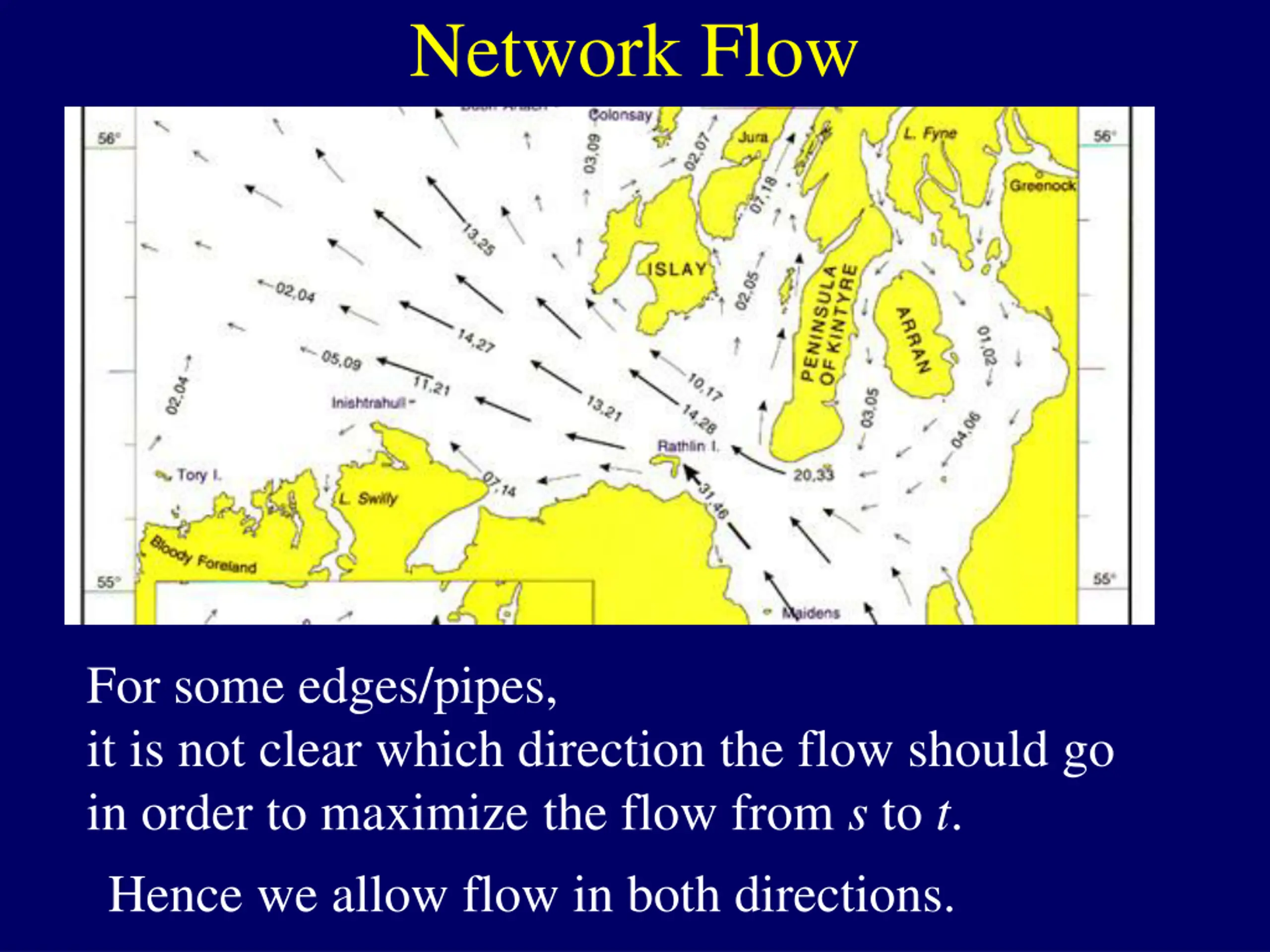 Network Flow For some edges/pipes, it is not clear which direction the flow should go in order to maximize the flow from s to t. Hence we allow flow in both directions.