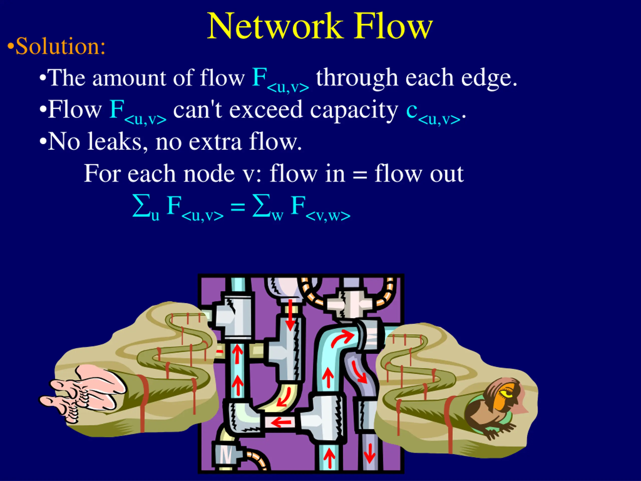 Network Flow Solution: The amount of flow F<u,v> through each edge. Flow F<u,v> can't exceed capacity c<u,v>. No leaks, no extra flow. For each node v: flow in = flow out u F<u,v> = w F<v,w>