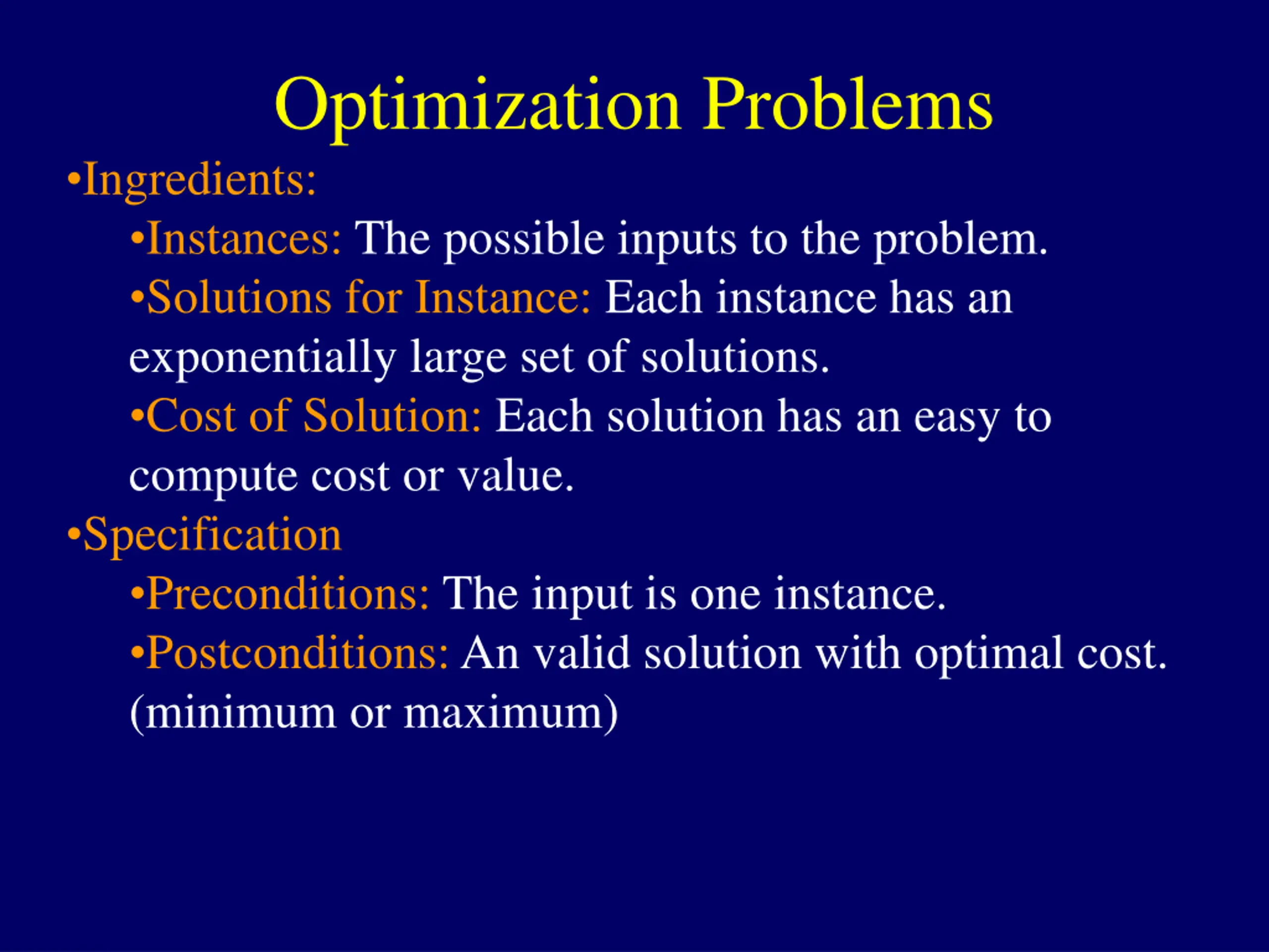 Optimization Problems Ingredients: Instances: The possible inputs to the problem. Solutions for Instance: Each instance has an exponentially large set of solutions. Cost of Solution: Each solution has an easy to compute cost or value. Specification Preconditions: The input is one instance. Postconditions: An valid solution with optimal cost. (minimum or maximum)